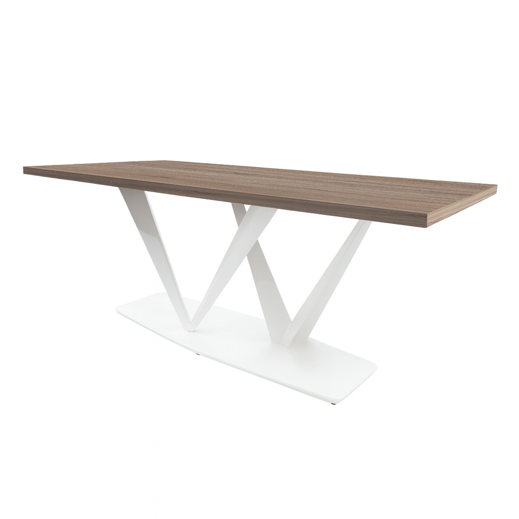Η Μοντέρνα τραπεζαρία 2V υψηλής αισθητικής, σχεδιασμένη για να αναβαθμίσει κάθε σύγχρονο χώρο. Η επιφάνεια από μελαμίνη σε ανοιχτή απόχρωση προσφέρει ζεστασιά και διαχρονικό χαρακτήρα, ενώ η στιβαρή μεταλλική βάση σε λευκο ματ φινίρισμα, με γεωμετρικό σχεδιασμό, εξασφαλίζει σταθερότητα και εντυπωσιακή παρουσία.