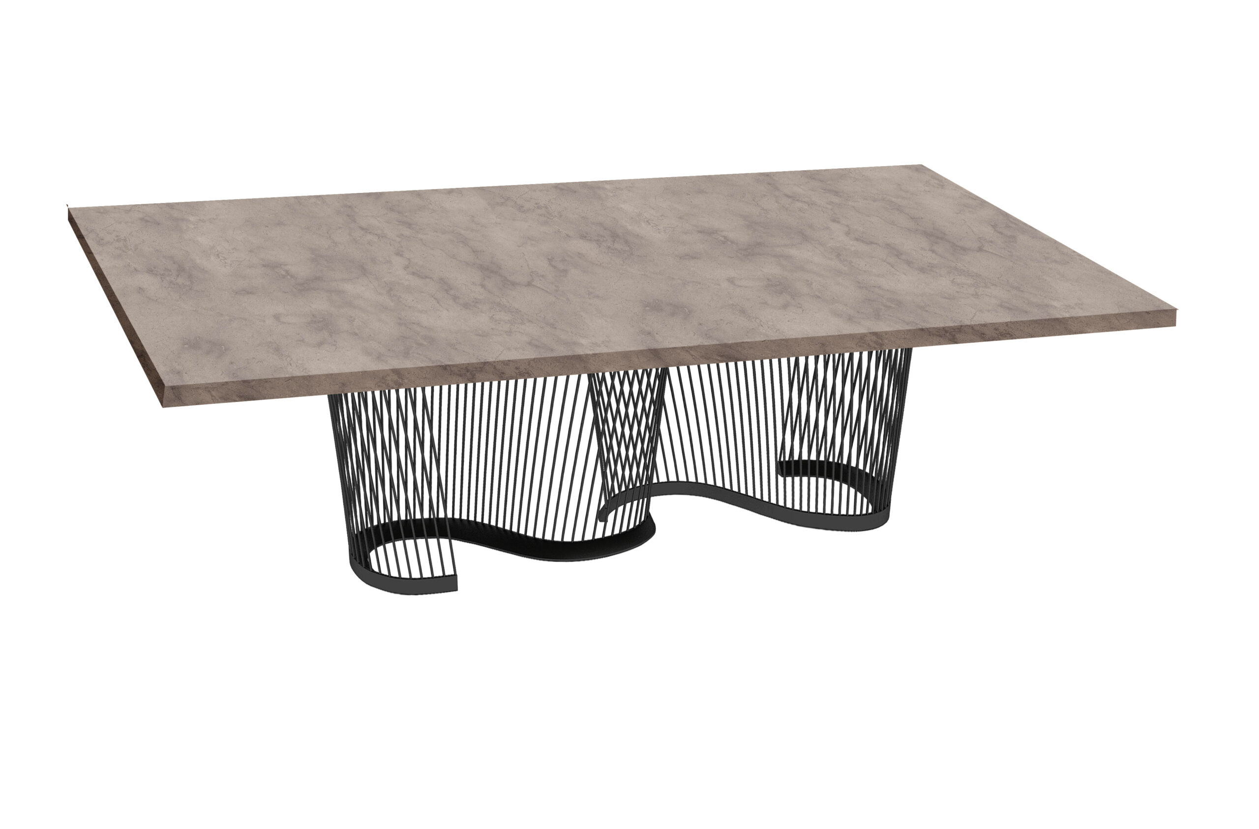 Αναβαθμίστε την αισθητική του χώρου σας με αυτό το μοναδικό τραπέζι φαγητού που συνδυάζει φυσική ομορφιά και μοντέρνο χαρακτήρα. Η επιφάνεια από ξύλο με όψη τσιμέντου σε ανοιχτό χρώμα με ρεαλιστική υφή αποπνέει κομψότητα, ενώ η ιδιαίτερη μεταλλική βάση με κυματιστή γεωμετρία προσδίδει σύγχρονη αρχιτεκτονική δυναμική στο σύνολο.