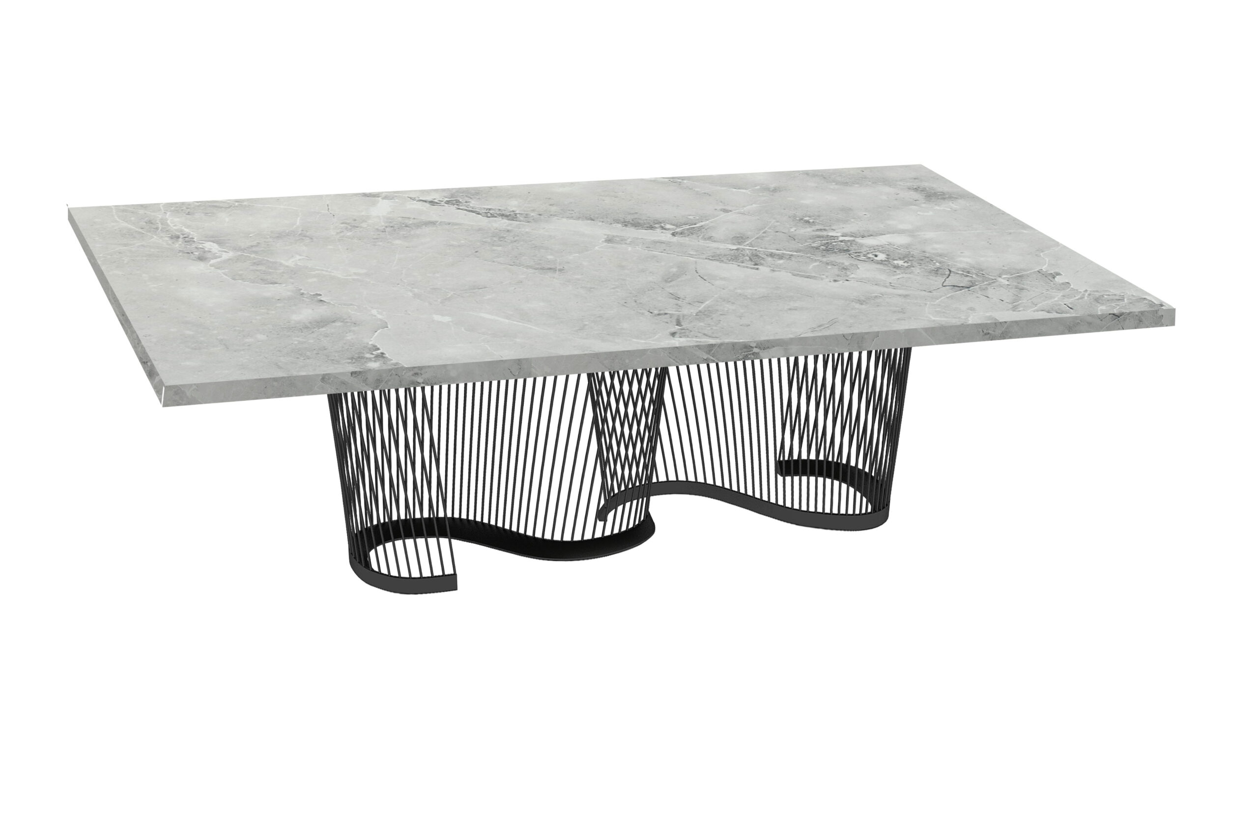 Αναβαθμίστε την αισθητική του χώρου σας με αυτό το μοναδικό τραπέζι φαγητού που συνδυάζει φυσική ομορφιά και μοντέρνο χαρακτήρα. Η επιφάνεια από ξύλο με όψη λευκού μάρμαρου  με ρεαλιστική υφή αποπνέει πολυτέλεια, ενώ η ιδιαίτερη μεταλλική βάση με κυματιστή γεωμετρία προσδίδει σύγχρονη αρχιτεκτονική δυναμική στο σύνολο.