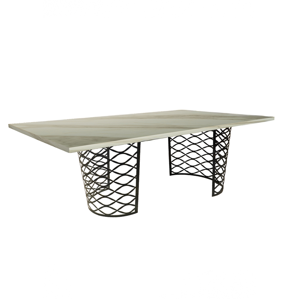 Ανακαλύψτε ένα τραπέζι που μετατρέπει την τραπεζαρία σας σε χώρο υψηλής αισθητικής. Η επιβλητική επιφάνεια, σε όψη λευκού μαρμαρου, ακουμπά επάνω σε μία από τις πιο ιδιαίτερες και αρχιτεκτονικά εντυπωσιακές βάσεις της αγοράς.