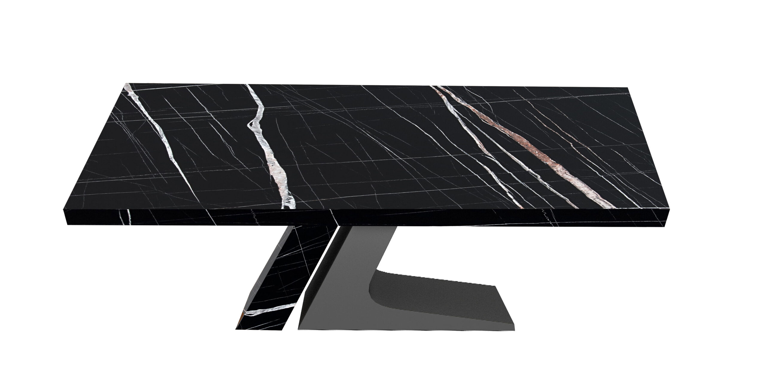 Ανανεώστε τον χώρο της τραπεζαρίας σας με αυτό το εντυπωσιακό τραπέζι φαγητού που συνδυάζει τη μοντέρνα αισθητική με την υψηλή ποιότητα κατασκευής. Διαθέτει επιφάνεια από μελαμίνη σε μαύρο μάρμαρο, που προσδίδει πολυτέλεια και κομψότητα στον χώρο. Η βάση του τραπεζιού ξεχωρίζει για τον ιδιαίτερο, γεωμετρικό σχεδιασμό της με μεταλλική κατασκευή σε μαύρη ματ απόχρωση, προσφέροντας σταθερότητα και μοναδικό στυλ.