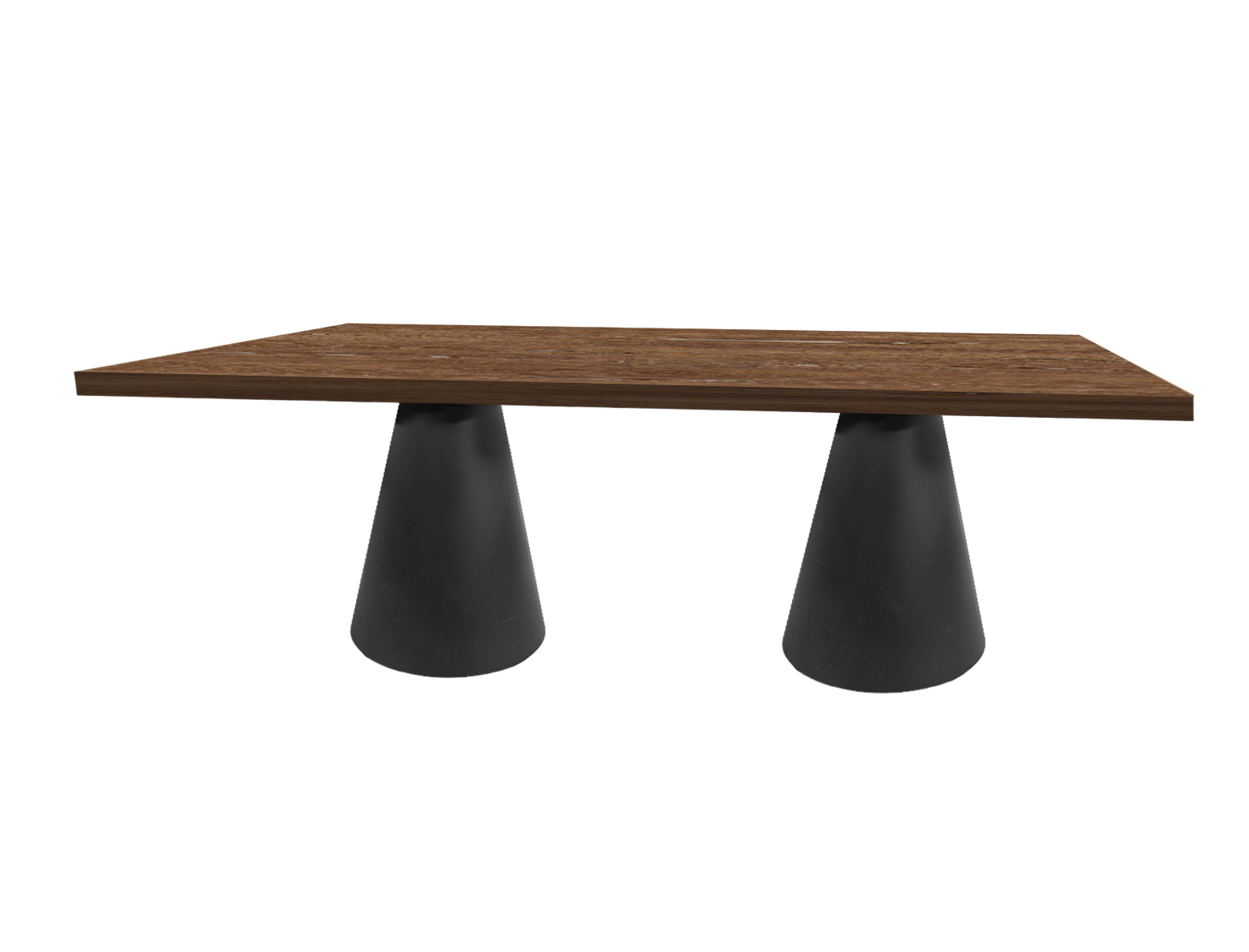 Η στήριξη γίνεται σε δύο εντυπωσιακές κωνικές βάσεις από μεταλλικό υλικό σε μαύρο ματ φινίρισμα, που εξασφαλίζουν σταθερότητα και ξεχωριστό design. Οι καθαρές γραμμές και οι γεωμετρικές φόρμες την καθιστούν statement κομμάτι που αναβαθμίζει κάθε τραπεζαρία ή επαγγελματικό χώρο φιλοξενίας.