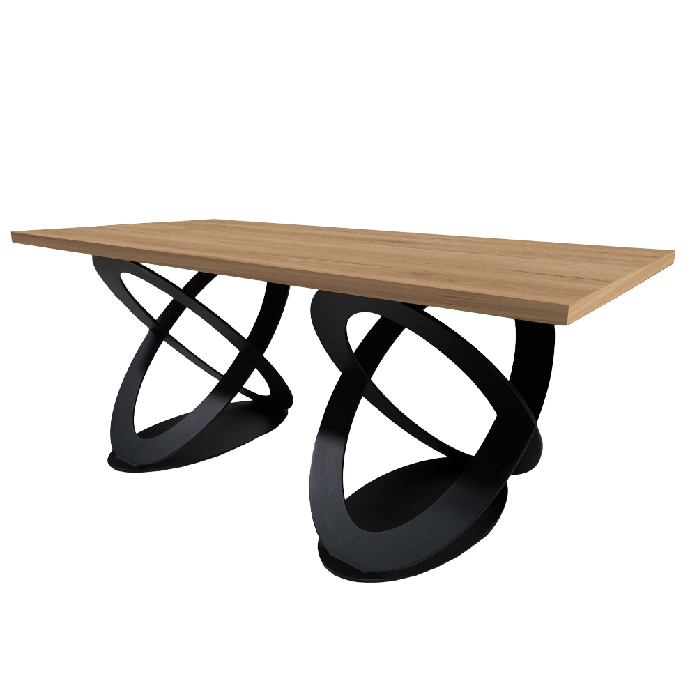 Η βάση από μαύρο μεταλλικό στοιχείο με καλλιτεχνικό, καμπυλωτό σχεδιασμό προσφέρει σταθερότητα και ξεχωριστή αισθητική, ιδανική για μοντέρνους ή industrial χώρους.