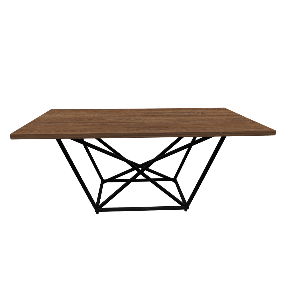 Η επιφάνειά του είναι κατασκευασμένη από ανθεκτική μελαμίνη σε καρυδί απόχρωση ξύλου, προσφέροντας υψηλή αντοχή και κομψότητα. Η μεταλλική βάση σε μαύρο ματ φινίρισμα, με σταυρωτή γεωμετρική σύνθεση, προσφέρει σταθερότητα και μοναδικό στυλ.