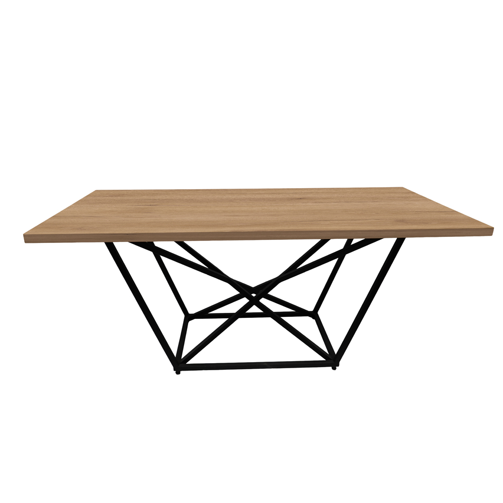 Η επιφάνειά του είναι κατασκευασμένη από ανθεκτική μελαμίνη σε φυσική απόχρωση ξύλου, προσφέροντας υψηλή αντοχή και κομψότητα. Η μεταλλική βάση σε μαύρο ματ φινίρισμα, με σταυρωτή γεωμετρική σύνθεση, προσφέρει σταθερότητα και μοναδικό στυλ.