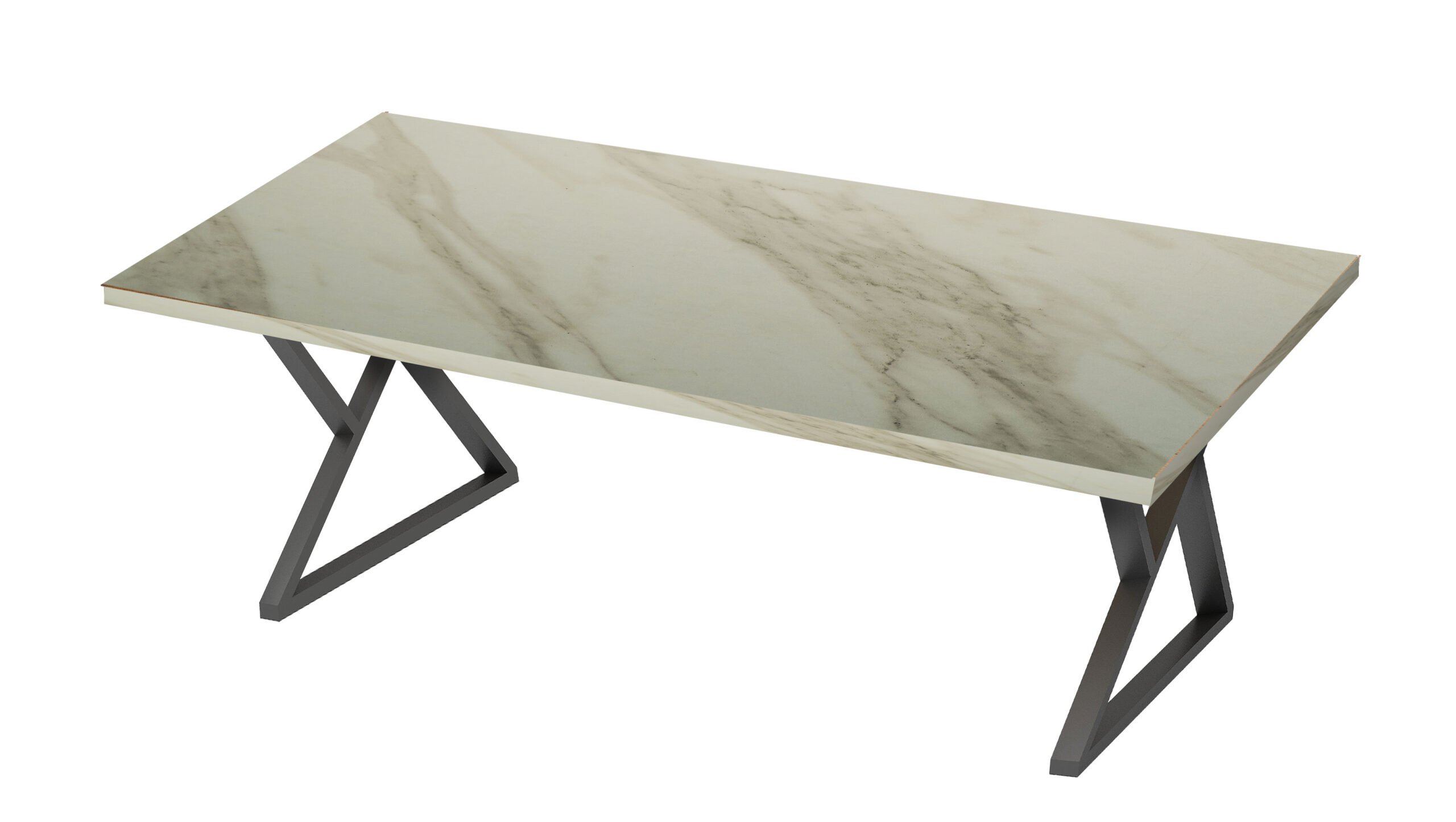 Η βάση αποτελείται από μεταλλικά πόδια σε ιδιαίτερο σχήμα, βαμμένα σε μαύρο ματ φινίρισμα, εξασφαλίζοντας σταθερότητα και μοντέρνα αισθητική. Ο σχεδιασμός του τραπεζιού το καθιστά ιδανική επιλογή για σύγχρονες κατοικίες αλλά και επαγγελματικούς χώρους εστίασης ή meeting rooms.