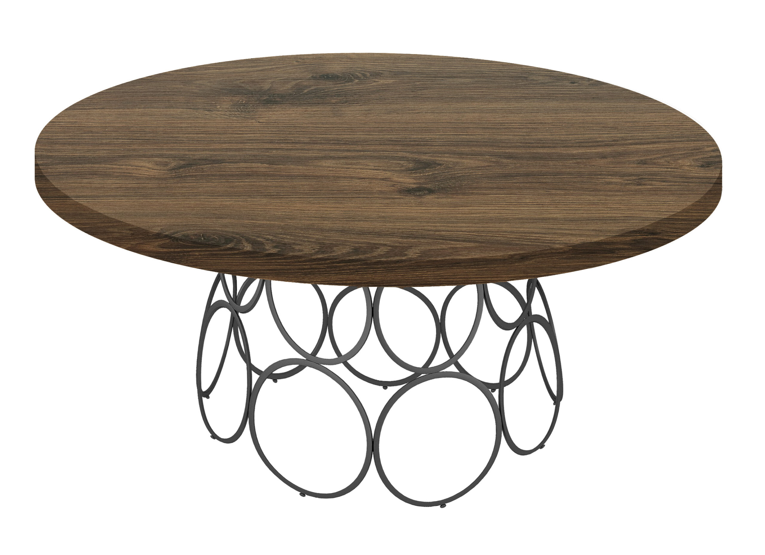 Ένα τραπέζι που εντυπωσιάζει με την πρώτη ματιά, συνδυάζοντας φυσική ζεστασιά και μοντέρνο design. Η στρογγυλή επιφάνεια σε σκούρο καφέ αναδεικνύει τις λεπτομέρειες του ξύλου, ενώ η καλλιτεχνική μεταλλική βάση με κυκλικό μοτίβο δημιουργεί μια αίσθηση ελαφρότητας και κομψότητας.