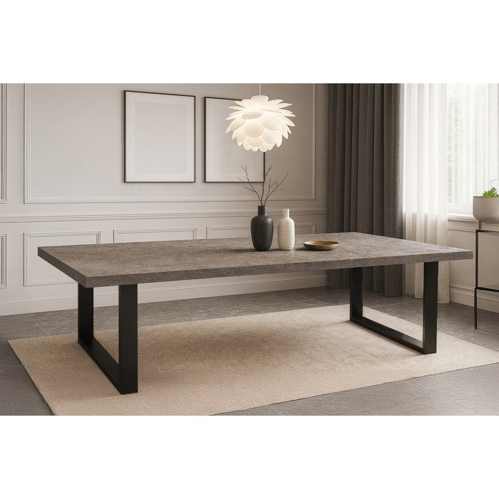 Η βάση αποτελείται από μεταλλικά πόδια σε γεωμετρικό ορθογώνιο σχήμα, βαμμένα σε μαύρο ματ φινίρισμα, που προσδίδουν βιομηχανικό χαρακτήρα και σταθερότητα. Το τραπέζι είναι κατάλληλο τόσο για οικιακή όσο και για επαγγελματική χρήση σε χώρους εστίασης ή γραφείων.