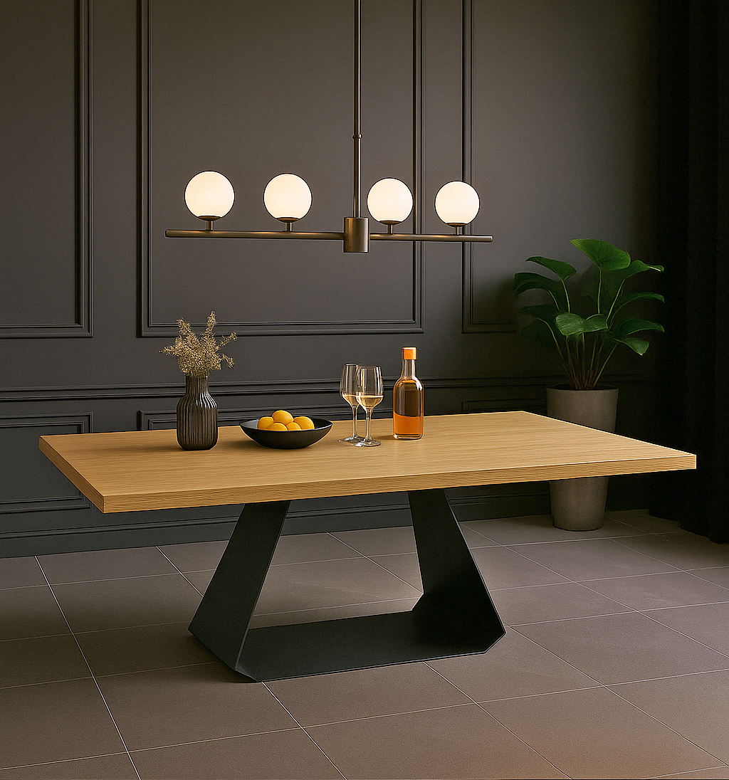 Ένα σύγχρονο τραπέζι φαγητού υψηλής αισθητικής με δρύινη επιφάνεια σε ίσιο τελείωμα και εντυπωσιακή μεταλλική βάση. Ο απόλυτος συνδυασμός διαχρονικού design, ποιοτικών υλικών και αρχιτεκτονικής ισορροπίας.