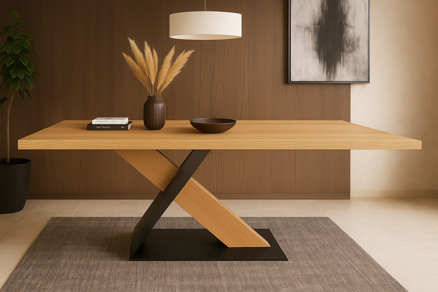 Η βάση του τραπεζιού είναι το πραγματικό σημείο αναφοράς. Συνδυάζει ξύλινο και μεταλλικό στοιχείο σε μία “Χ” διασταύρωση, που εκφράζει ισορροπία και σταθερότητα, ενώ λειτουργεί ως καλλιτεχνική σύνθεση. Η μεταλλική επιφάνεια με ηλεκτροστατική βαφή σε μαύρο ματ προσφέρει δυναμική αντίθεση με το φυσικό χρώμα του ξύλου, ενισχύοντας την premium ταυτότητά του.