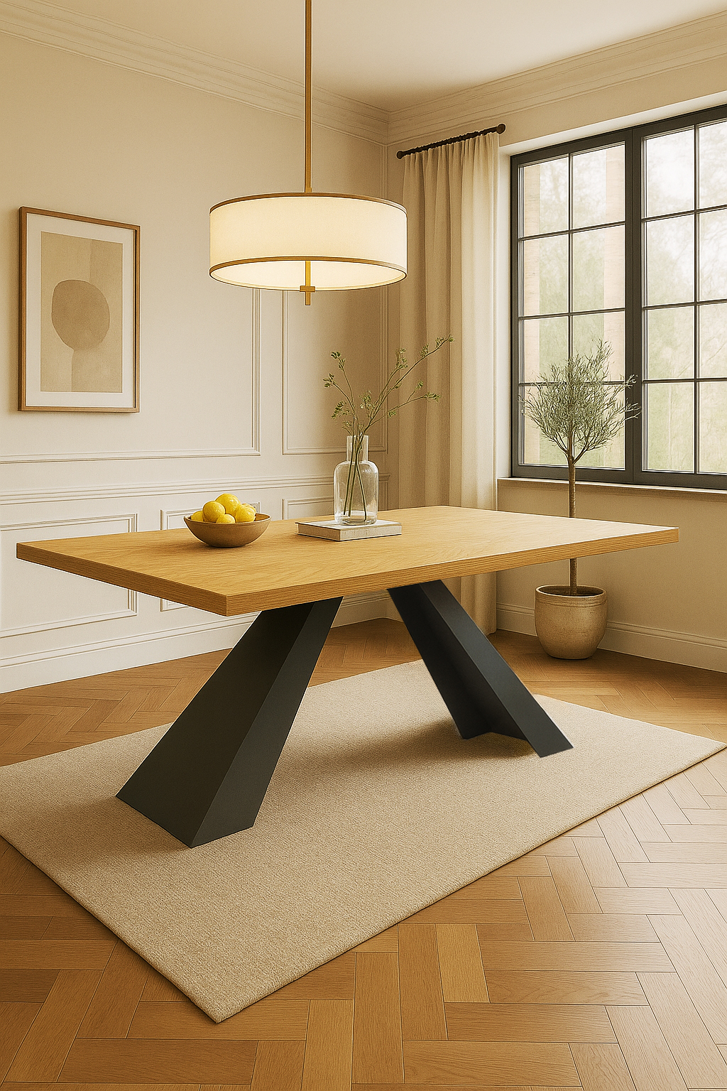 Κομψό και μοντέρνο τραπέζι φαγητού με δρύινη επιφάνεια και εντυπωσιακή μεταλλική βάση. Ιδανικό για κάθε σύγχρονο χώρο, προσφέρει μοναδικό συνδυασμό αισθητικής και αντοχής.