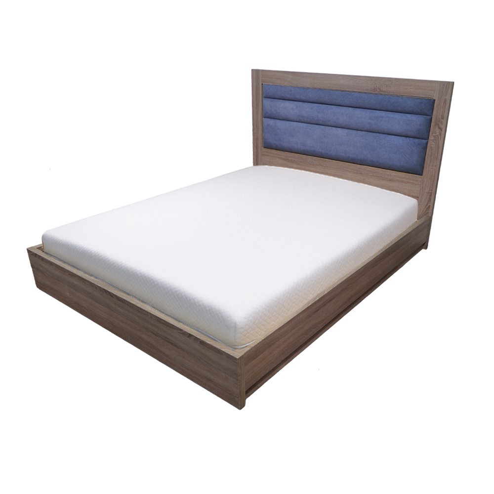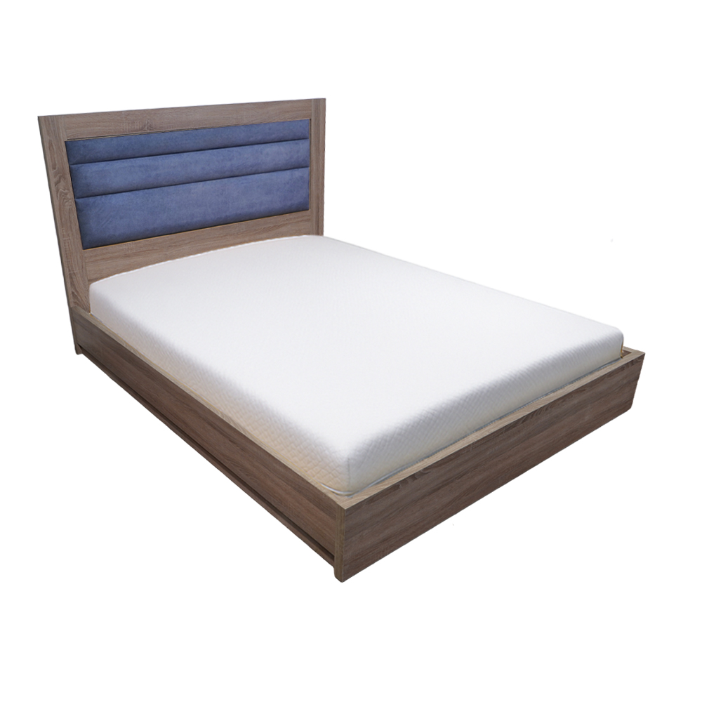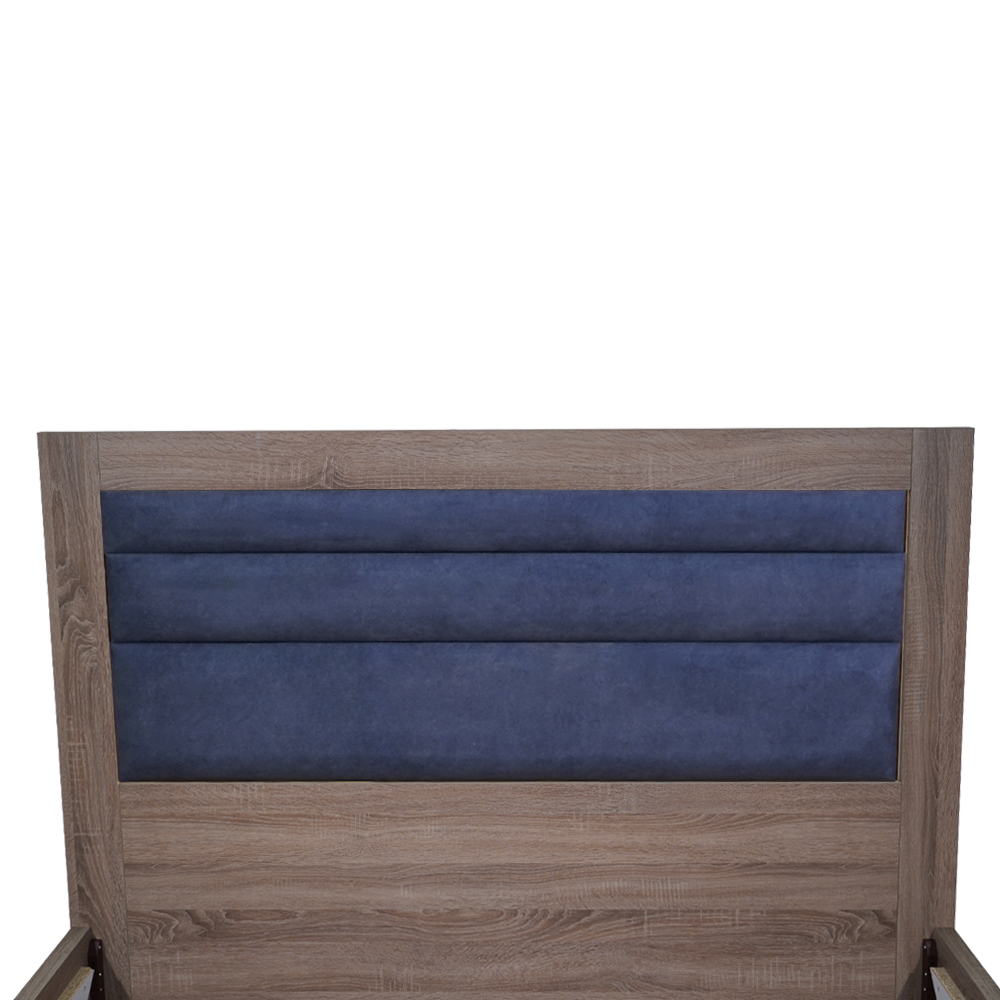 Ανανεώστε το υπνοδωμάτιό σας με αυτό το κομψό κρεβάτι, που συνδυάζει τη ζεστασιά του φυσικού ξύλου με την άνεση ενός υφασμάτινου προσκέφαλου. Η στιβαρή ξύλινη βάση προσφέρει εξαιρετική αντοχή και σταθερότητα, ενώ η επενδυμένη μπλε πλάτη δημιουργεί μια ευχάριστη αντίθεση και προσδίδει μοντέρνο χαρακτήρα στον χώρο.