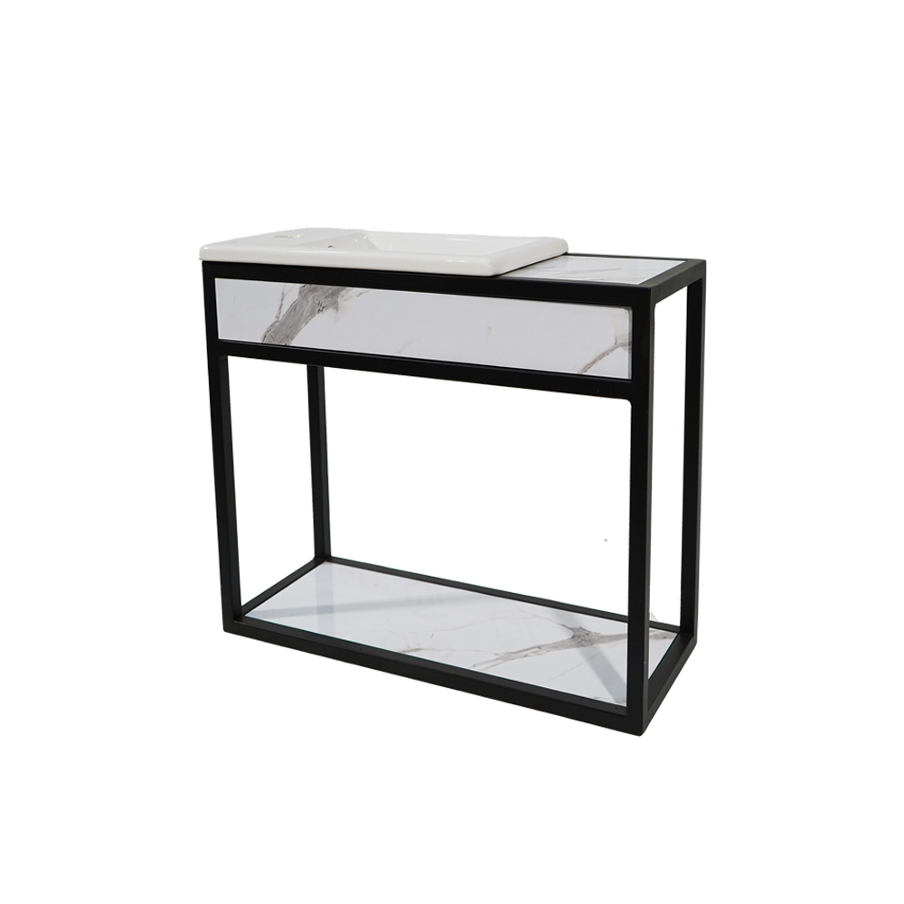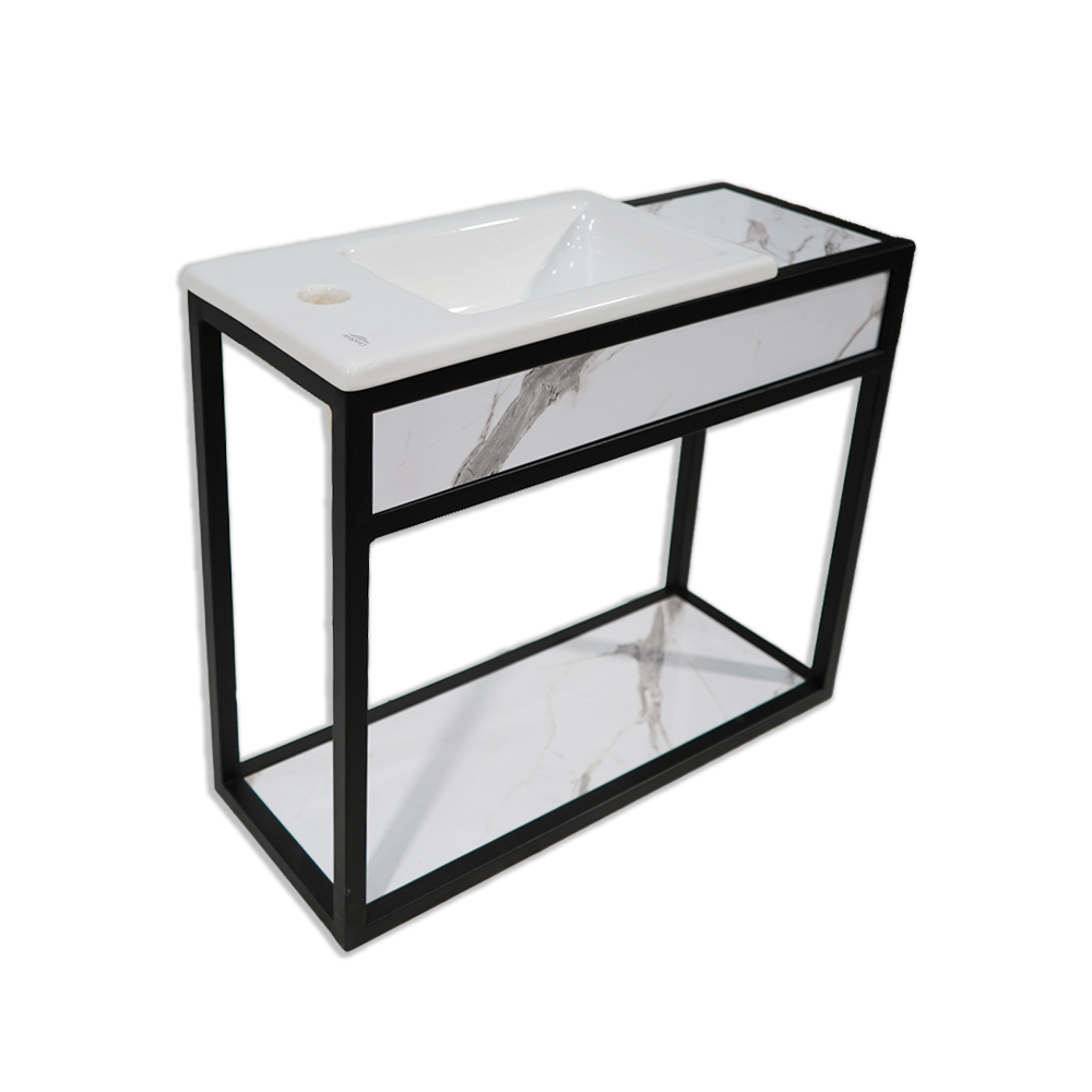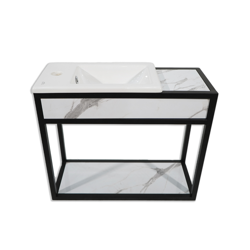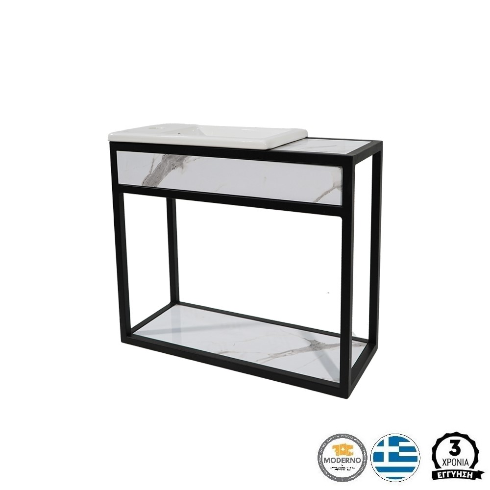 Αναβαθμίστε την αισθητική του μπάνιου σας με αυτό το κομψό, κρεμαστό έπιπλο μπάνιου που συνδυάζει εκλεπτυσμένη πολυτέλεια και λειτουργικότητα. Ο μοντέρνος σχεδιασμός του με μεταλλικό σκελετό σε μαύρο ματ χρώμα και επιφάνεια με όψη μαρμάρου δημιουργεί μια αίσθηση αρμονίας και διαχρονικής κομψότητας στον χώρο.