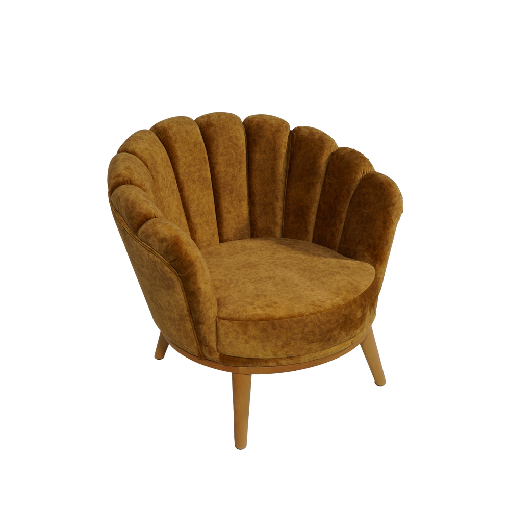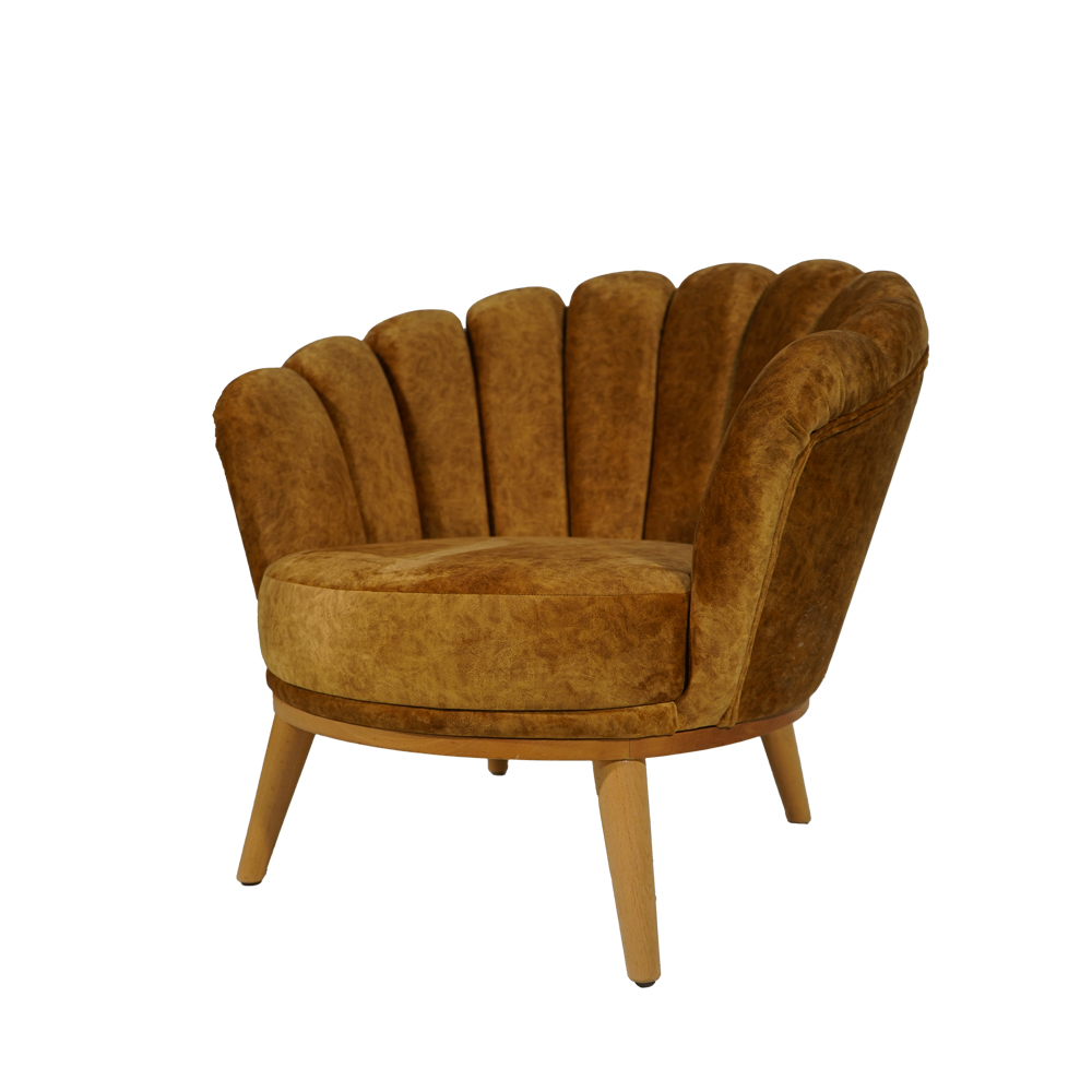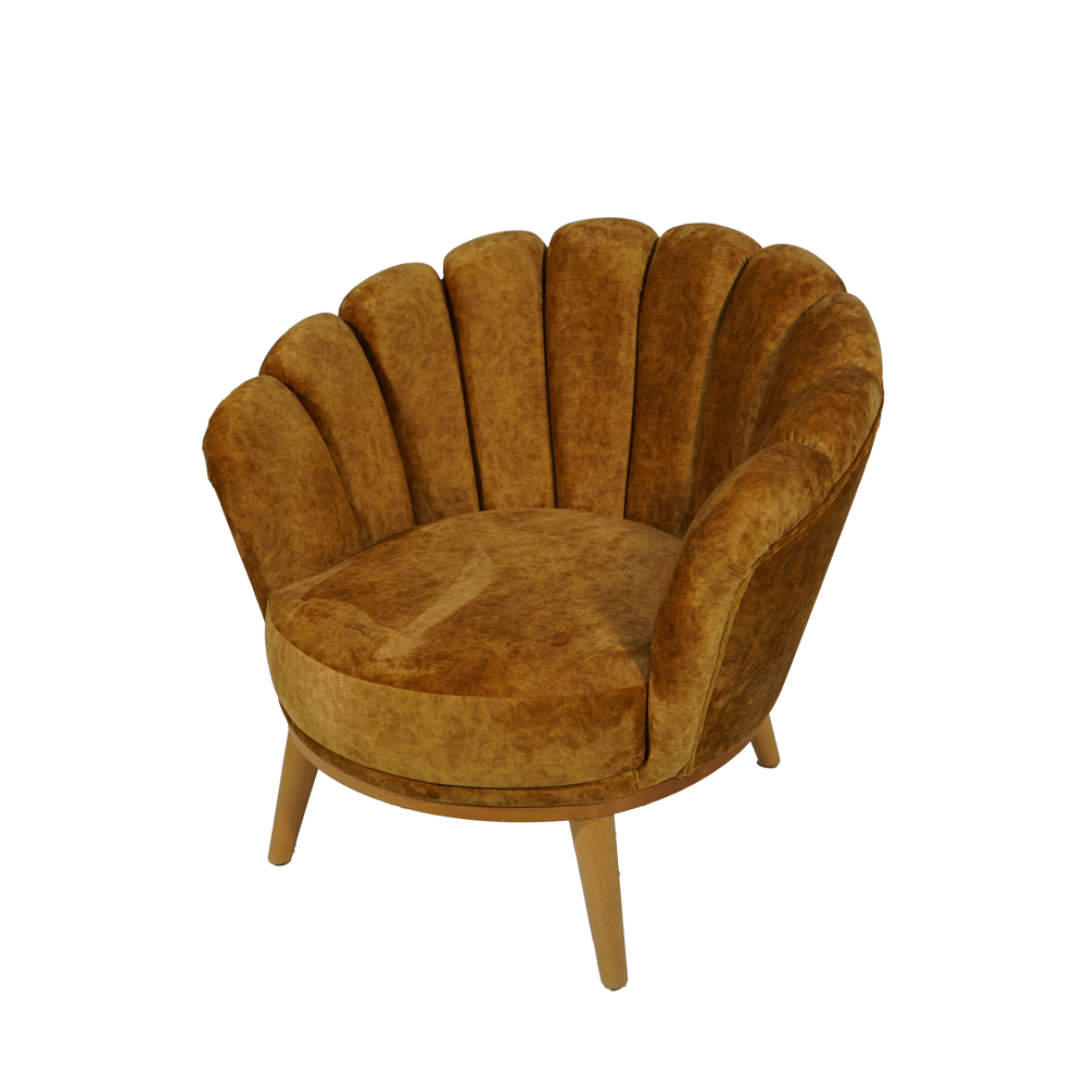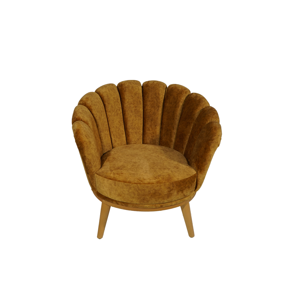 Αναδείξτε τον χώρο σας με αυτή τη μοναδική πολυθρόνα σε στιλ κοχυλιού που συνδυάζει ρετρό αισθητική και σύγχρονη άνεση. Η βελούδινη υφή της σε μουσταρδί απόχρωση προσδίδει ζεστασιά και πολυτέλεια, ενώ η σκαλιστή πλάτη αγκαλιάζει το σώμα προσφέροντας στήριξη και στιλ.