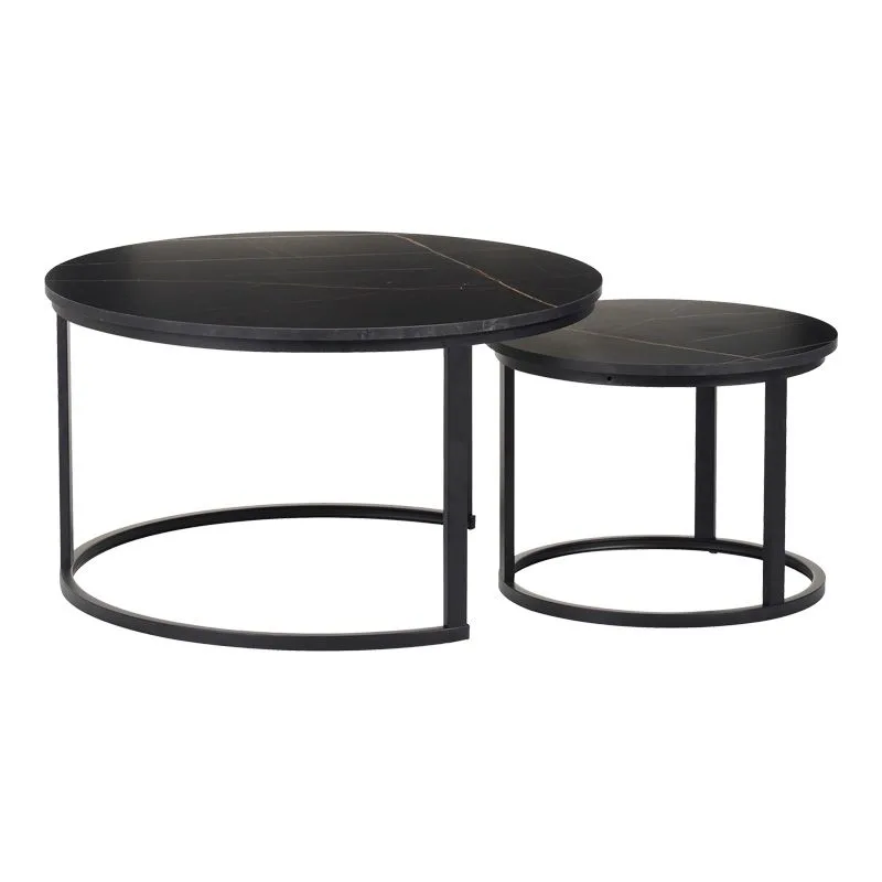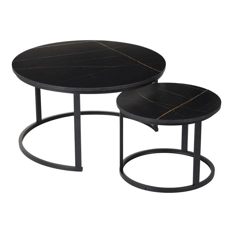 Τραπέζια σαλονιού Solme I 2τεμ σε μαύρο μαρμάρου απόχρωση με μαύρα μεταλλικά πόδια