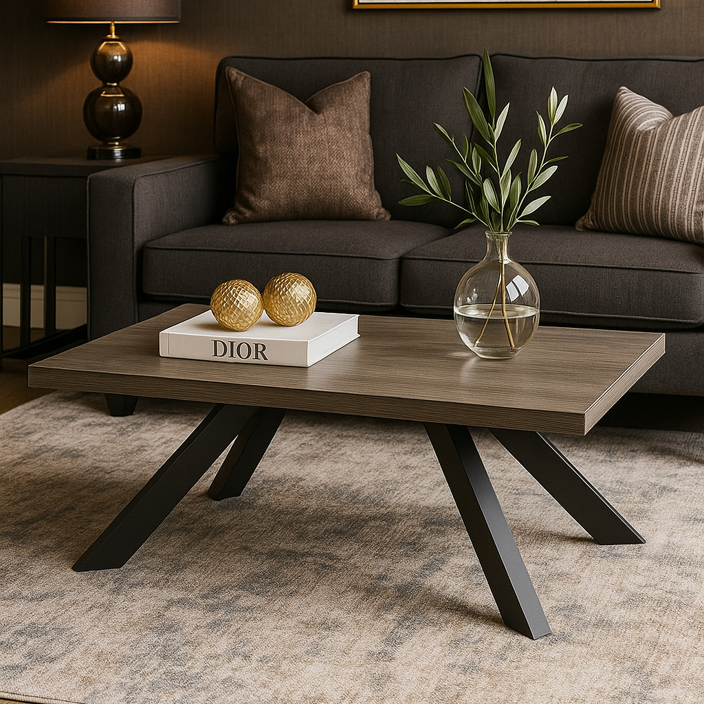 Αναβαθμίστε το καθιστικό σας με αυτό το μοντέρνο τραπέζι σαλονιού, που συνδυάζει κομψότητα και πρακτικότητα. Η επιφάνειά του σε απόχρωση σταχτί προσδίδει φυσική ζεστασιά, ενώ τα μεταλλικά πόδια σε μαύρο ματ χρώμα χαρίζουν σταθερότητα και βιομηχανικό χαρακτήρα.