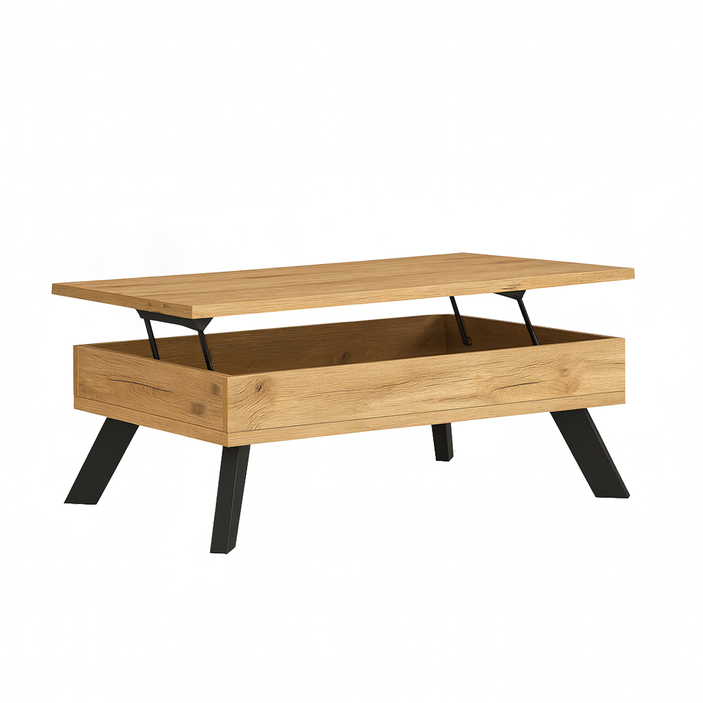 Η επιφάνεια ανυψώνεται εύκολα με μεταλλικούς μηχανισμούς, αποκαλύπτοντας ευρύχωρο αποθηκευτικό χώρο για αντικείμενα όπως τηλεχειριστήρια, περιοδικά ή ακόμα και laptop. Η σταθερή μεταλλική βάση σε μαύρη απόχρωση προσθέτει βιομηχανική αισθητική και εξασφαλίζει στιβαρότητα και αντοχή.