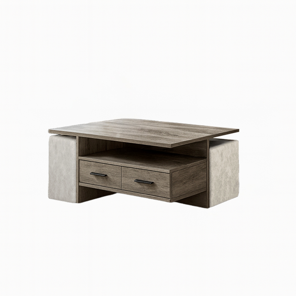 Το τραπέζι διαθέτει δύο ευρύχωρα συρτάρια με μεταλλικές λαβές, προσφέροντας άνεση στην αποθήκευση μικροαντικειμένων, τηλεχειριστηρίων ή περιοδικών. Επιπλέον, η ανοιχτή κεντρική επιφάνεια μπορεί να χρησιμοποιηθεί για διακοσμητικά στοιχεία ή πρακτικά αντικείμενα, διατηρώντας τον χώρο τακτοποιημένο και λειτουργικό.
