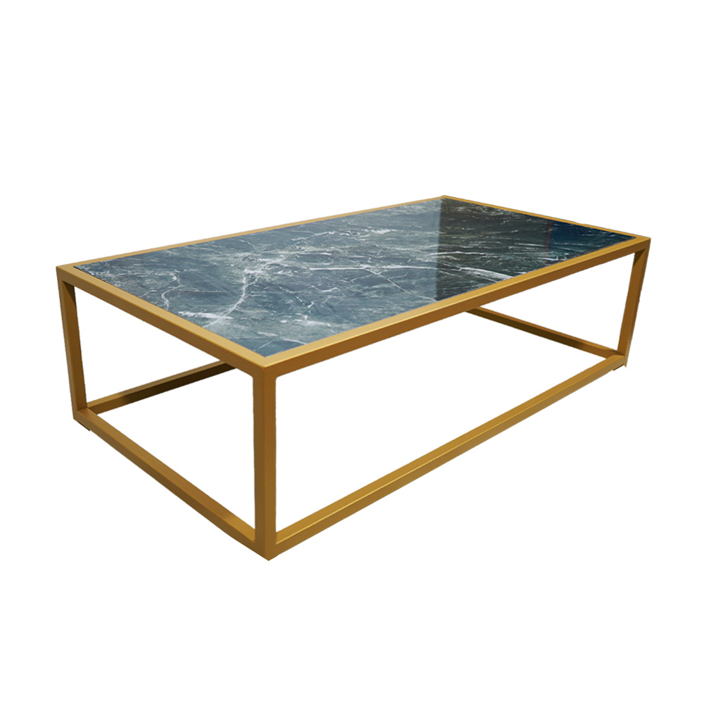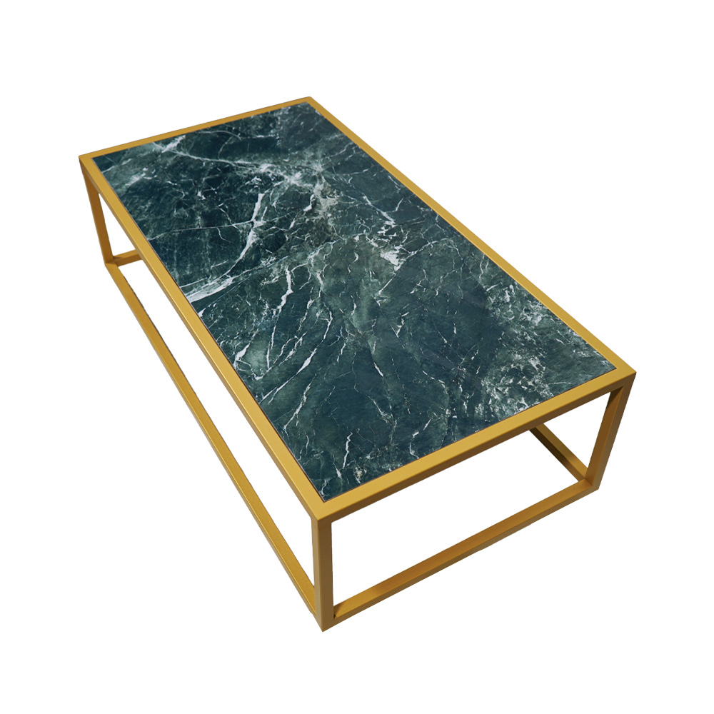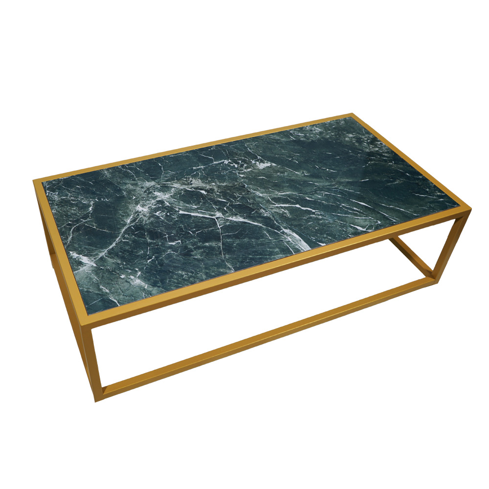 Αναβαθμίστε τον χώρο του σαλονιού σας με ένα κομψό και διαχρονικό κομμάτι σχεδιασμού. Το τραπεζάκι σαλονιού διαθέτει πολυτελή επιφάνεια από πλακάκι με όψη σε πράσινο μάρμαρο με φυσικά νερά, προσφέροντας μοναδική αισθητική και εκλεπτυσμένη υφή. Η μοντέρνα, χρυσή μεταλλική βάση με γραμμικό design εξασφαλίζει σταθερότητα, αντοχή και στυλ.