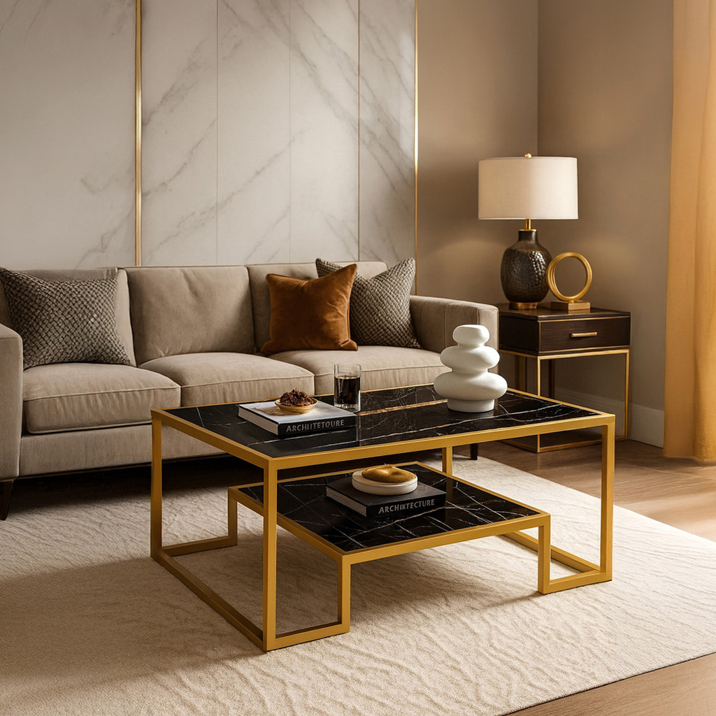 ΤΡΑΠΕΖΙ ΣΑΛΟΝΙΟΥ ROMEO ΜΕ ΕΠΙΦΑΝΕΙΑ ΜΑΥΡΟ ΜΑΡΜΑΡΟ ΚΑΙ ΜΕΤΑΛΛΙΚΟ ΣΚΕΛΕΤΟ