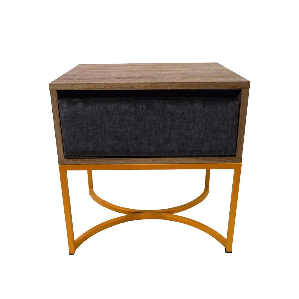 Μια εκλεπτυσμένη πρόταση για υπνοδωμάτια που συνδυάζει μοντέρνο design με διαχρονικά υλικά. Το σώμα του κομοδίνου διαθέτει φυσική ξύλινη όψη, ενώ το εμπρός μέρος του συρταριού είναι επενδυμένο με μαλακό, βελούδινο ύφασμα σε κομψό γκρί χρώμα. Η χρυσή μεταλλική βάση με καμπύλες λεπτομέρειες χαρίζει σταθερότητα και μια διακριτική λάμψη πολυτέλειας.