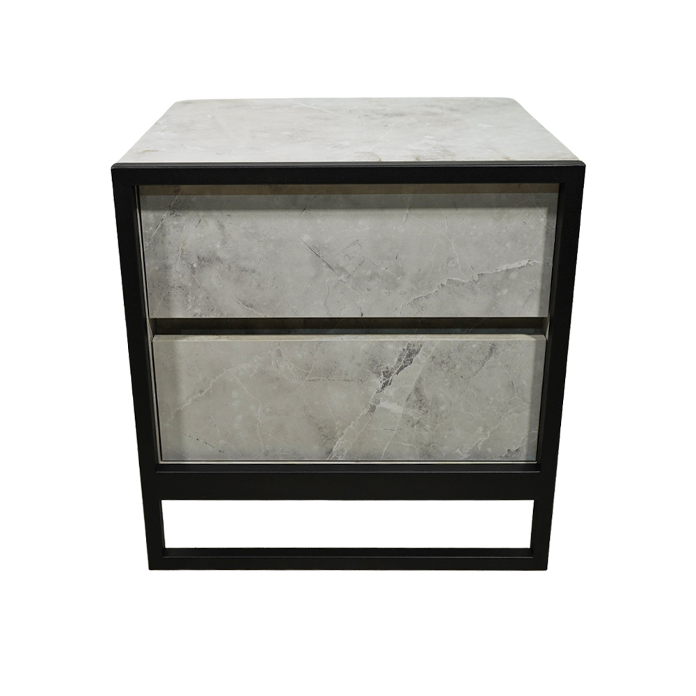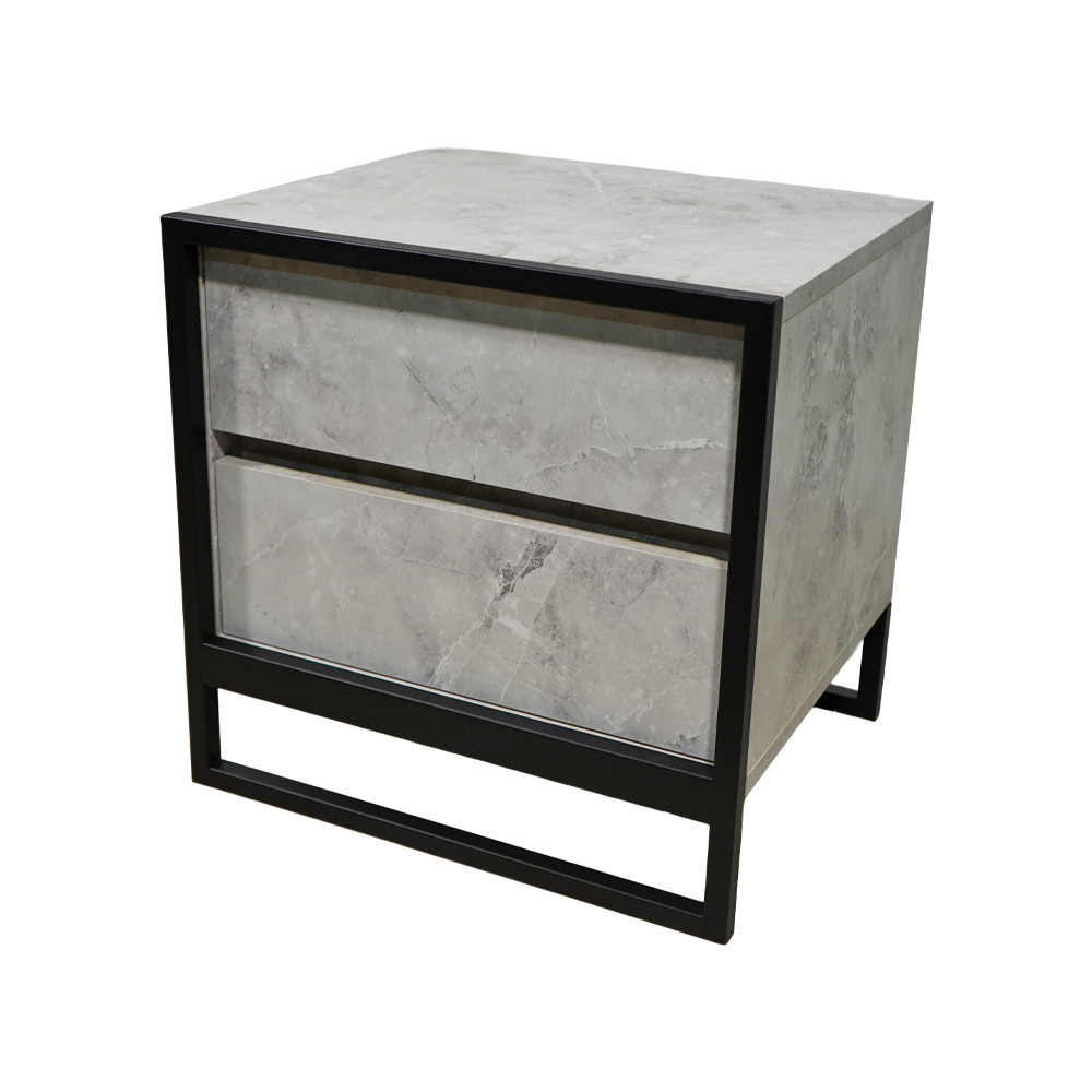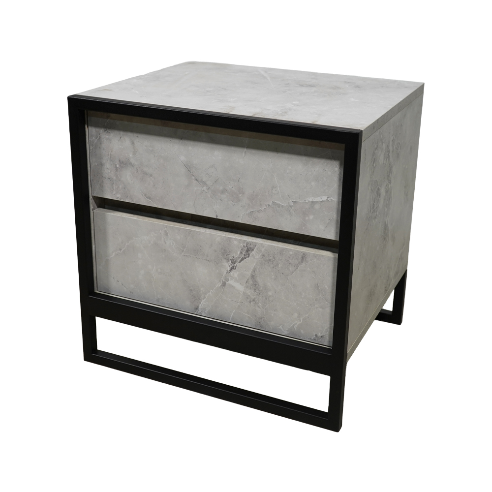 Το σώμα του κομοδίνου είναι κατασκευασμένο από υψηλής ποιότητας Mελαμίνη με όψη λευκού μάρμαρου με γκρι νερα προσδίδοντας μια αίσθηση πολυτέλειας. Διαθέτει δύο ευρύχωρα συρτάρια χωρίς εμφανείς λαβές, για καθαρή και μινιμαλιστική αισθητική.