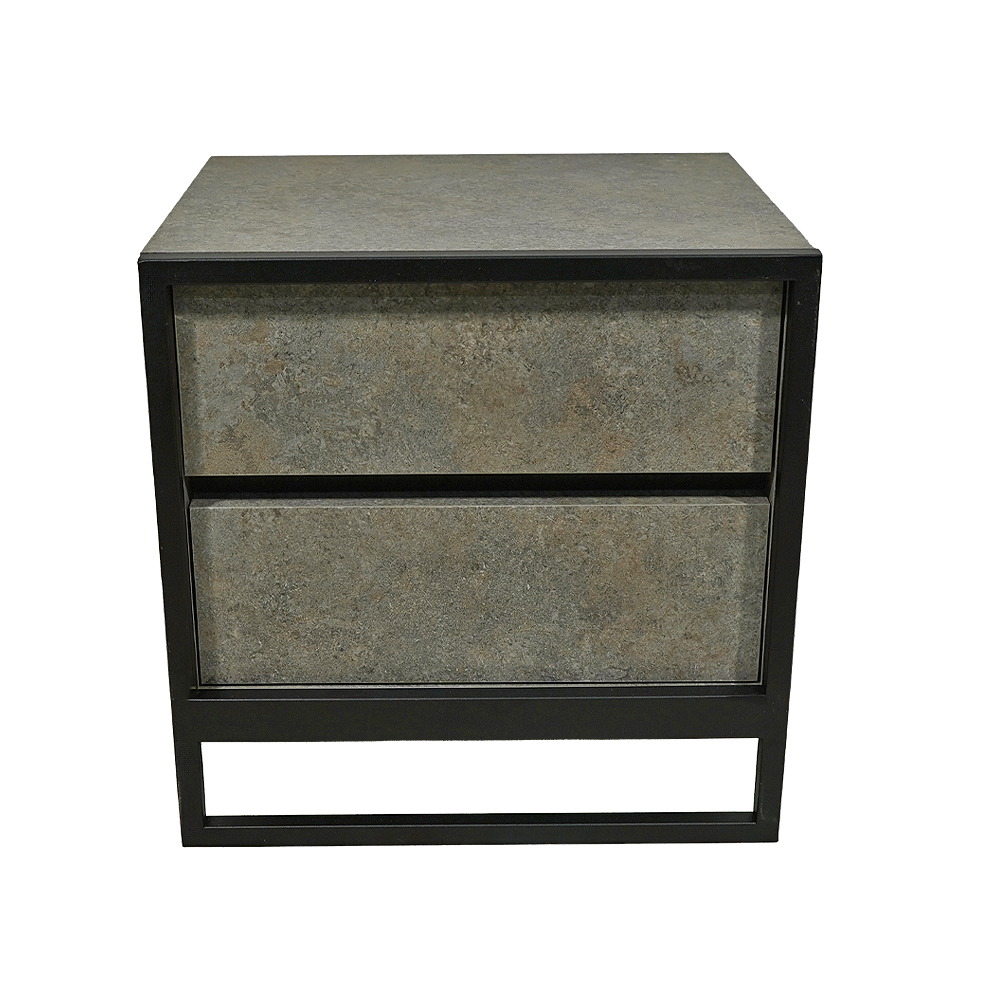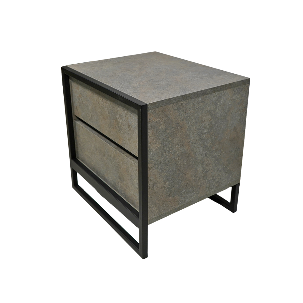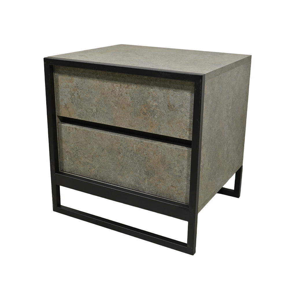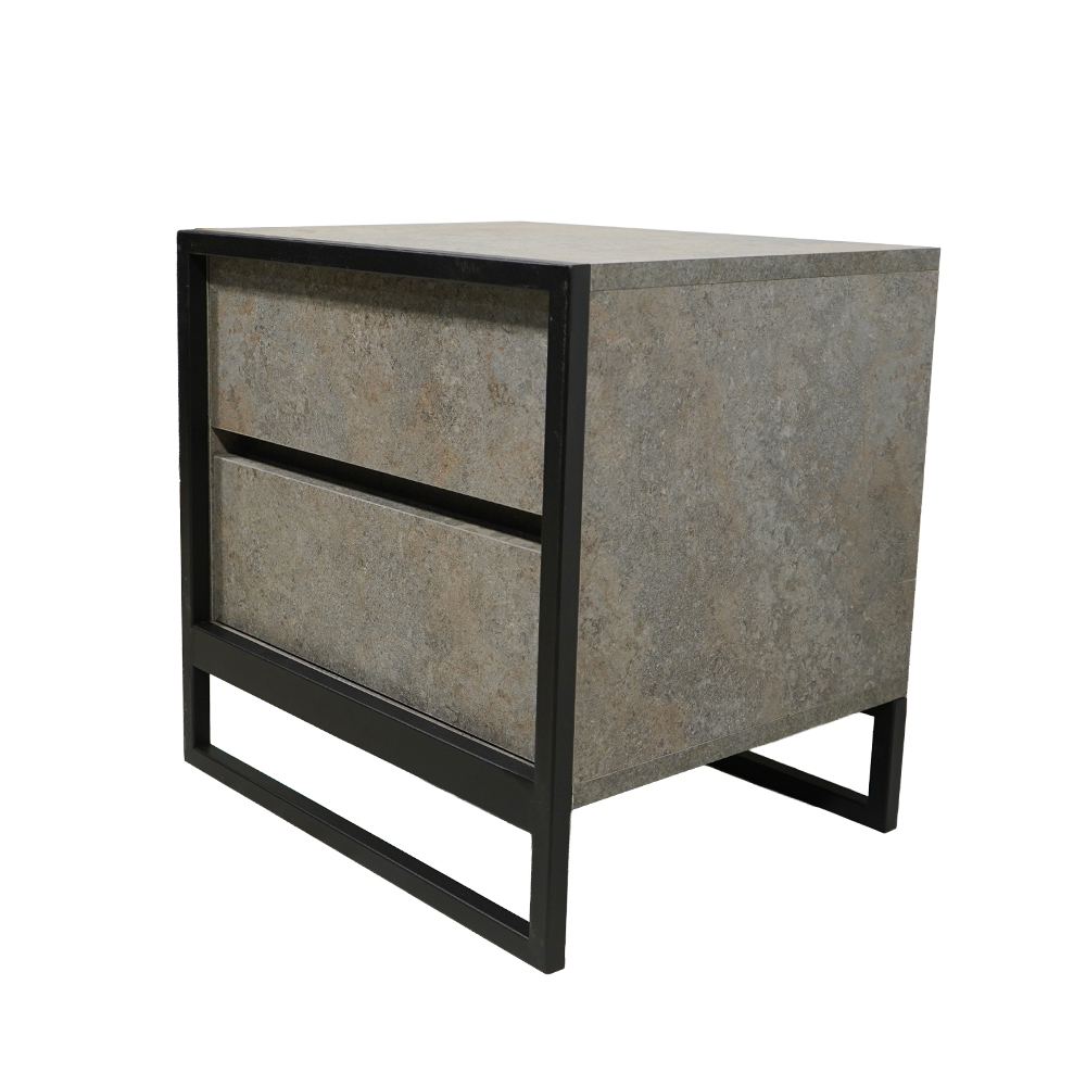 Το σώμα του κομοδίνου είναι κατασκευασμένο από υψηλής ποιότητας Mελαμίνη με όψη τσιμέντου σε σκούρο χρώμα προσδίδοντας μια αίσθηση πολυτέλειας. Διαθέτει δύο ευρύχωρα συρτάρια χωρίς εμφανείς λαβές, για καθαρή και μινιμαλιστική αισθητική.
