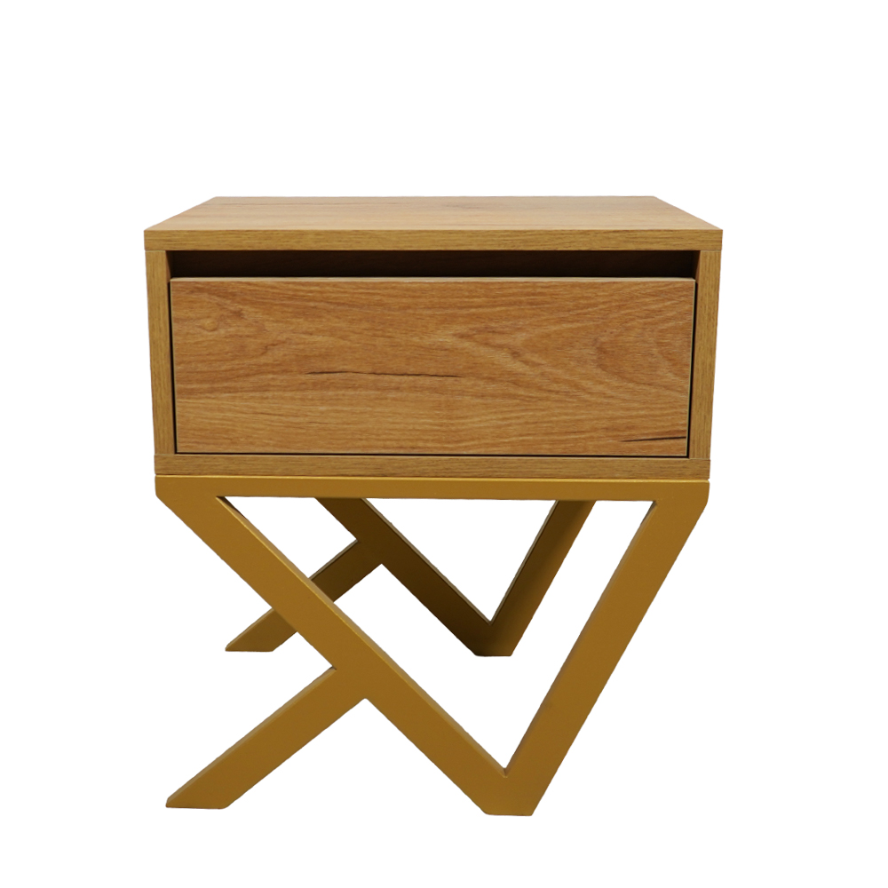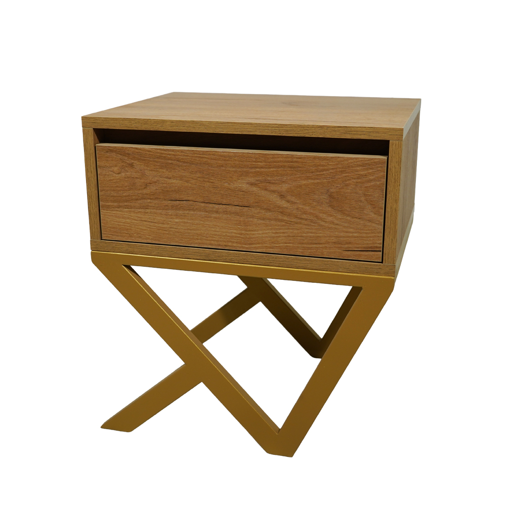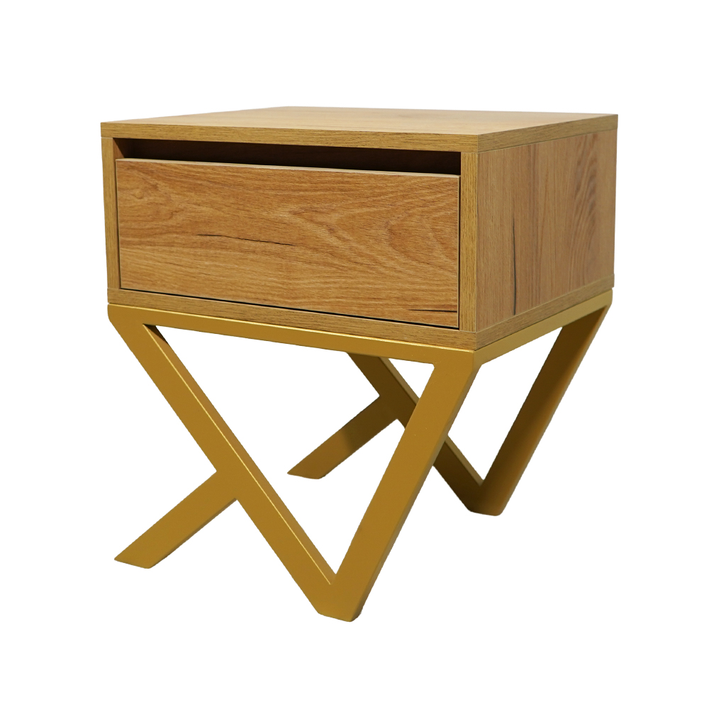 Το μοντέρνο αυτό κομοδίνο συνδυάζει μίνιμαλ αισθητική με πρωτότυπο σχεδιασμό, προσφέροντας στυλ και λειτουργικότητα σε κάθε χώρο. Το σώμα του, σε ανοιχτή απόχρωση ξύλου, αποπνέει κομψότητα και καθαρότητα, ενώ η ιδιαίτερη βάση του αποτελεί το στοιχείο που το ξεχωρίζει. Η μεταλλική βάση με γεωμετρικό, διασταυρούμενο σχεδιασμό προσδίδει μοντέρνο χαρακτήρα και υψηλή σταθερότητα. Οι καθαρές γραμμές και οι ασύμμετρες γωνίες δημιουργούν ένα αρχιτεκτονικό αποτέλεσμα που τραβά το βλέμμα, καθιστώντας το κομοδίνο ιδανικό για σύγχρονους και εκλεπτυσμένους εσωτερικούς χώρους.