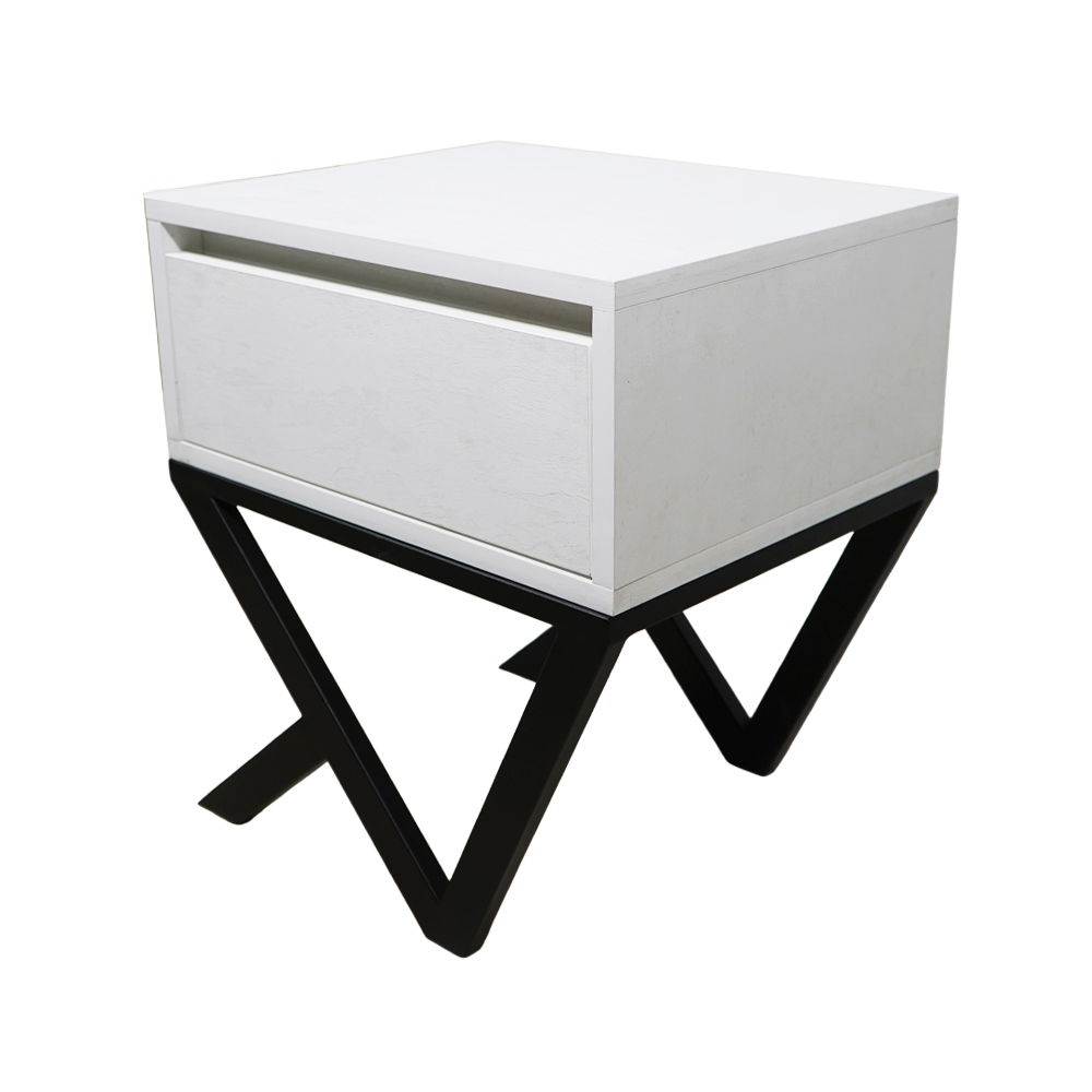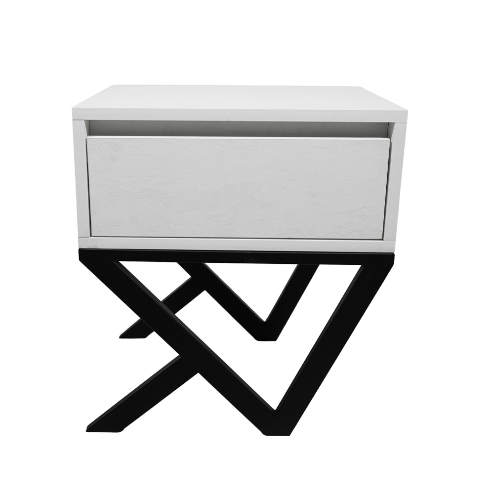 Το μοντέρνο αυτό κομοδίνο συνδυάζει μίνιμαλ αισθητική με πρωτότυπο σχεδιασμό, προσφέροντας στυλ και λειτουργικότητα σε κάθε χώρο. Το σώμα του, σε λευκό φινίρισμα, αποπνέει κομψότητα και καθαρότητα, ενώ η ιδιαίτερη βάση του αποτελεί το στοιχείο που το ξεχωρίζει. Η μεταλλική βάση με γεωμετρικό, διασταυρούμενο σχεδιασμό προσδίδει μοντέρνο χαρακτήρα και υψηλή σταθερότητα. Οι καθαρές γραμμές και οι ασύμμετρες γωνίες δημιουργούν ένα αρχιτεκτονικό αποτέλεσμα που τραβά το βλέμμα, καθιστώντας το κομοδίνο ιδανικό για σύγχρονους και εκλεπτυσμένους εσωτερικούς χώρους.