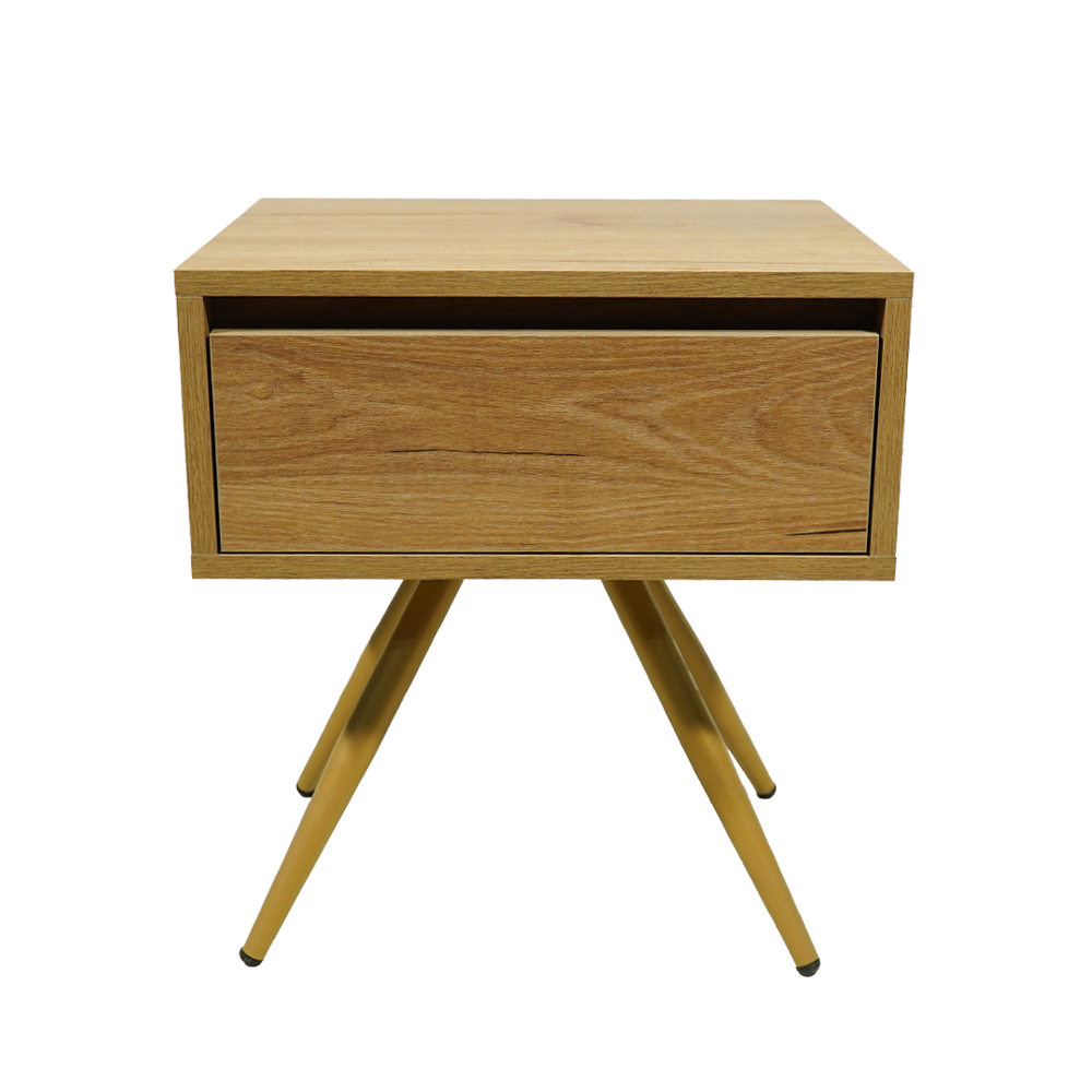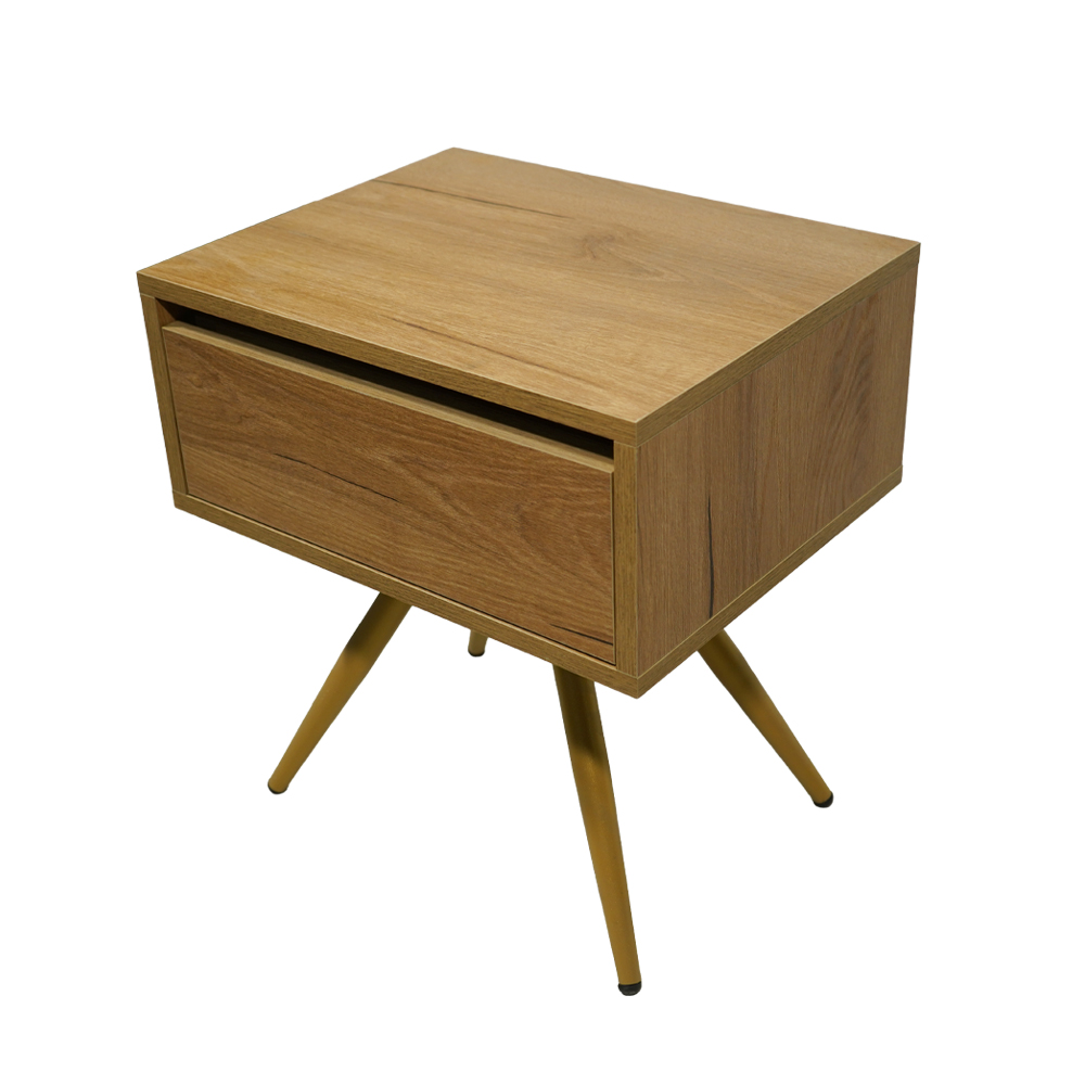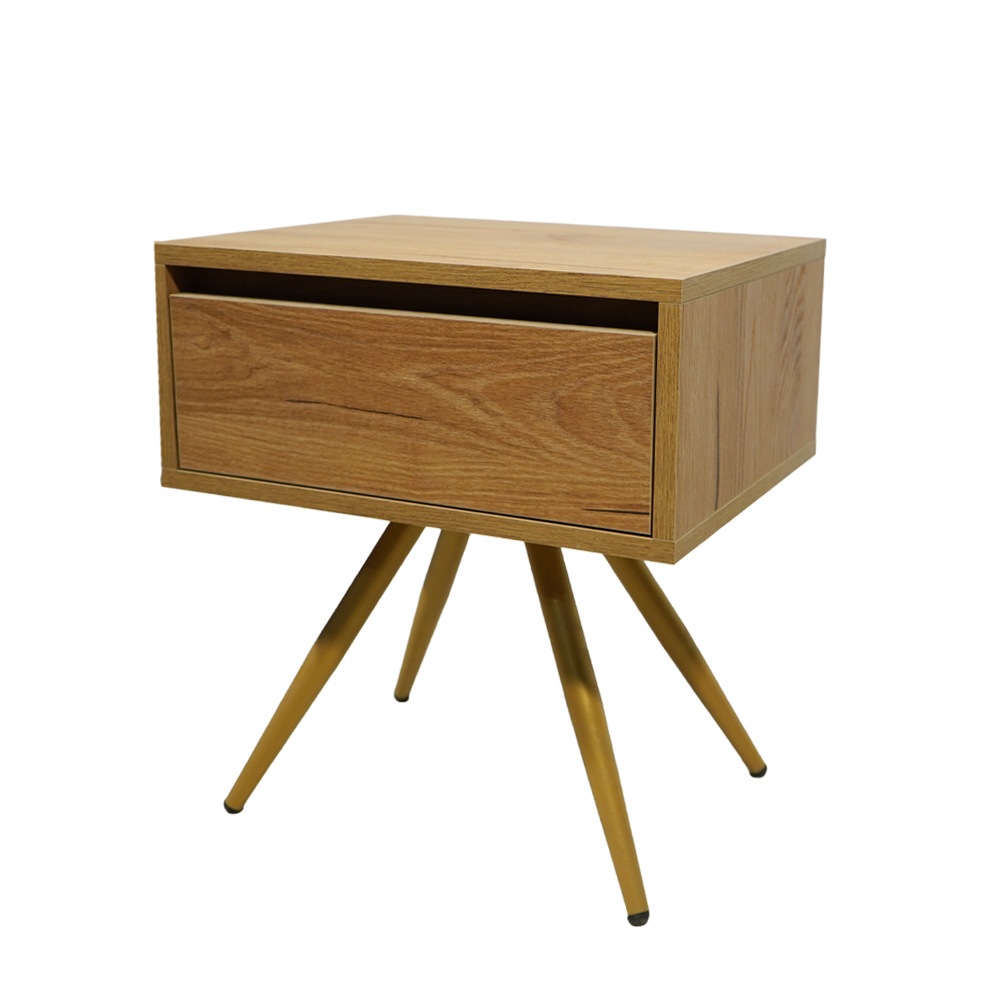 Το κομοδίνο Komo-Nord συνδυάζει την αυθεντικότητα  με μοντέρνες πινελιές, ιδανικό για χώρους που αποζητούν διαχρονική κομψότητα. Κατασκευασμένο από μελαμίνη με ρεαλιστική όψη ξύλου σε ανοιχτή απόχρωση και χαρακτηριστικά “νερά”, διαθέτει έναν ενιαίο αποθηκευτικό χώρο με διακριτικό συρτάρι. Η βάση αποτελείται από τέσσερα λοξά μεταλλικά πόδια σε χρυσή απόχρωση, που προσδίδουν σταθερότητα και εκλεπτυσμένο στυλ.