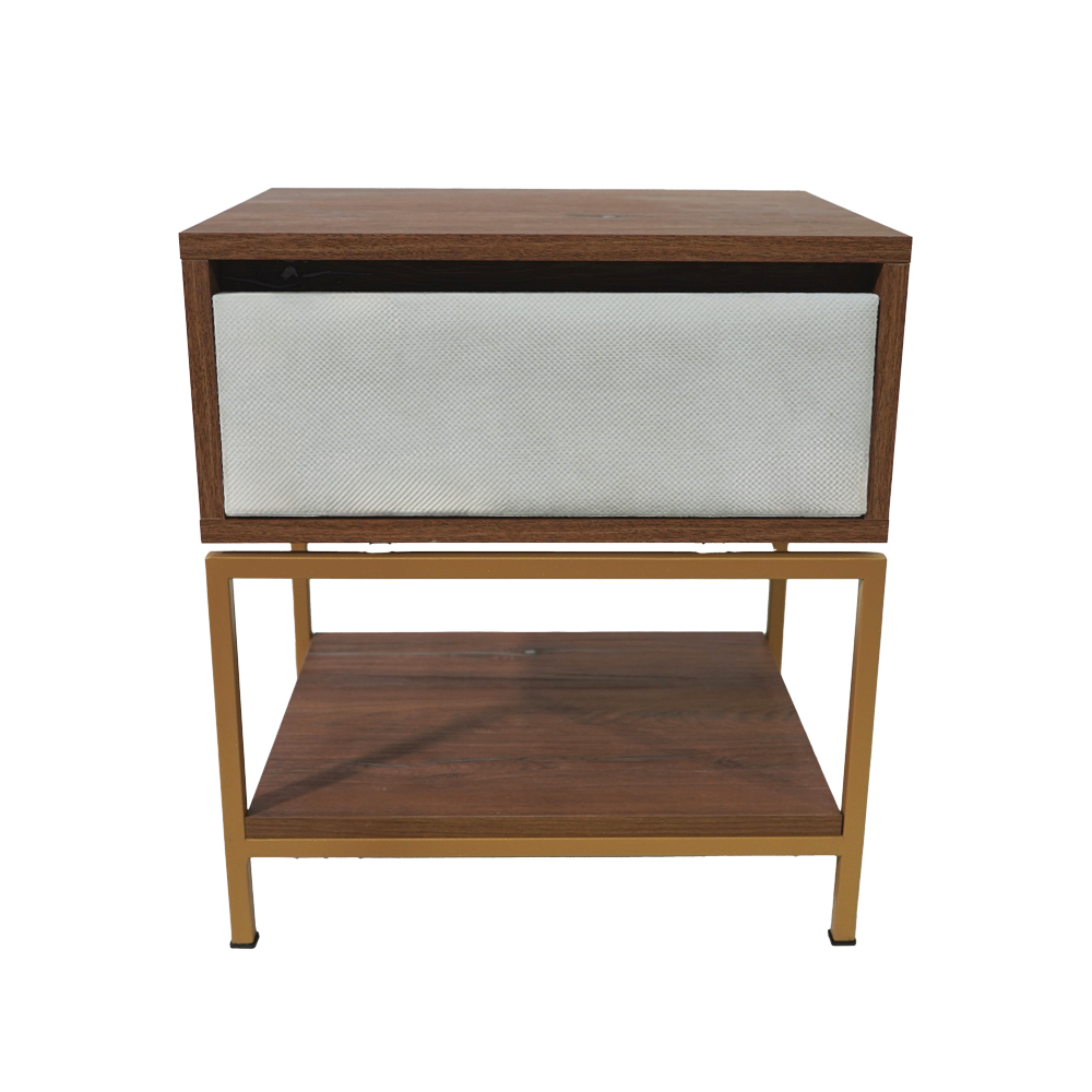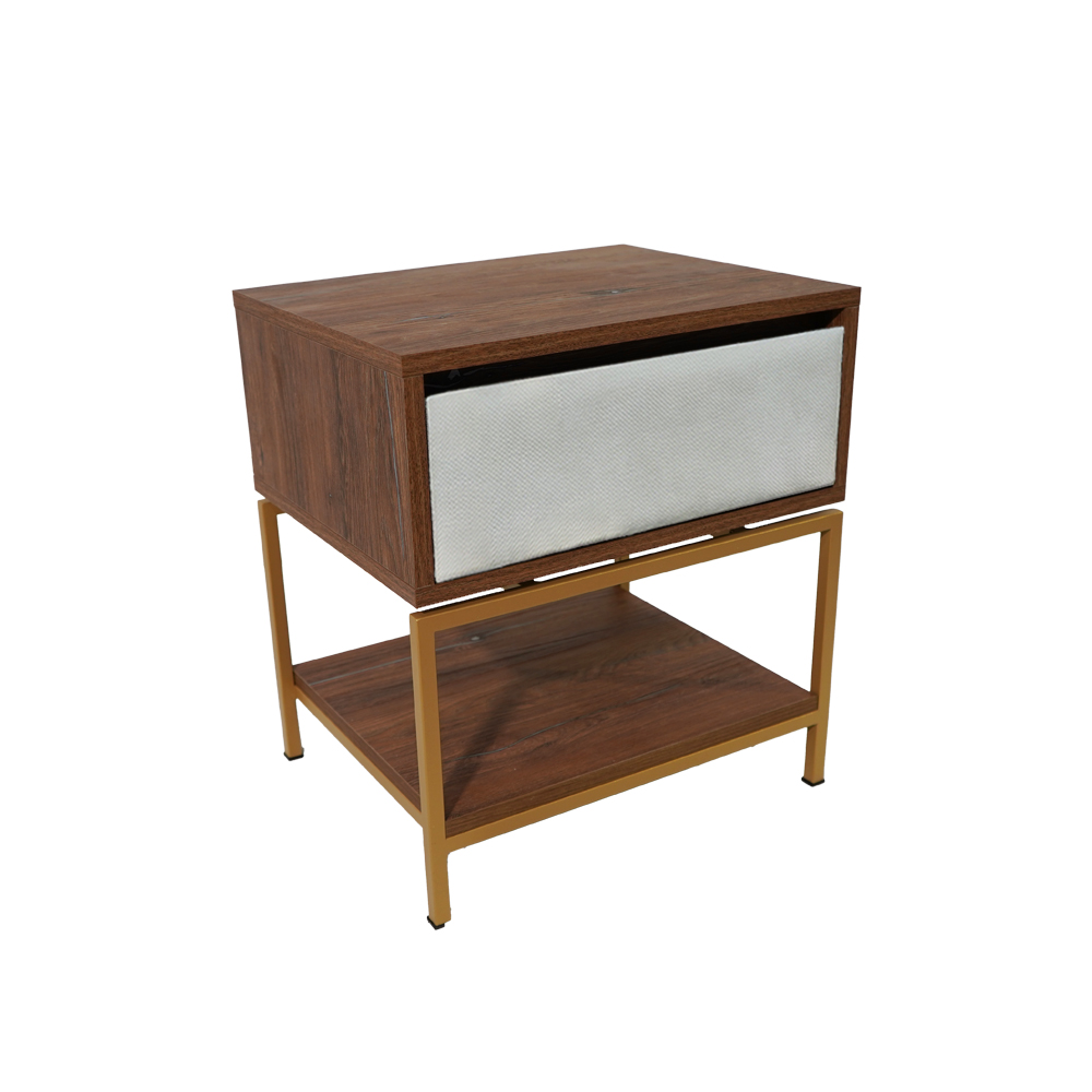 Το κομοδίνο Komo-Woodtex συνδυάζει την κομψότητα του φυσικού ξύλου με τον βιομηχανικό χαρακτήρα του μετάλλου, προσφέροντας μια στιβαρή και ταυτόχρονα εκλεπτυσμένη προσθήκη στον χώρο σας. Το σώμα από φυσικό ξύλο διαθέτει ένα μεγάλο συρτάρι με dusty grey υφασμάτινη πρόσοψη και μαλακή υφή, ιδανικό για καθημερινή χρήση. Η χρυσή μεταλλική βάση παρέχει εξαιρετική σταθερότητα και φιλοξενεί μια ανοιχτή ραφιέρα για επιπλέον αποθηκευτικό χώρο.