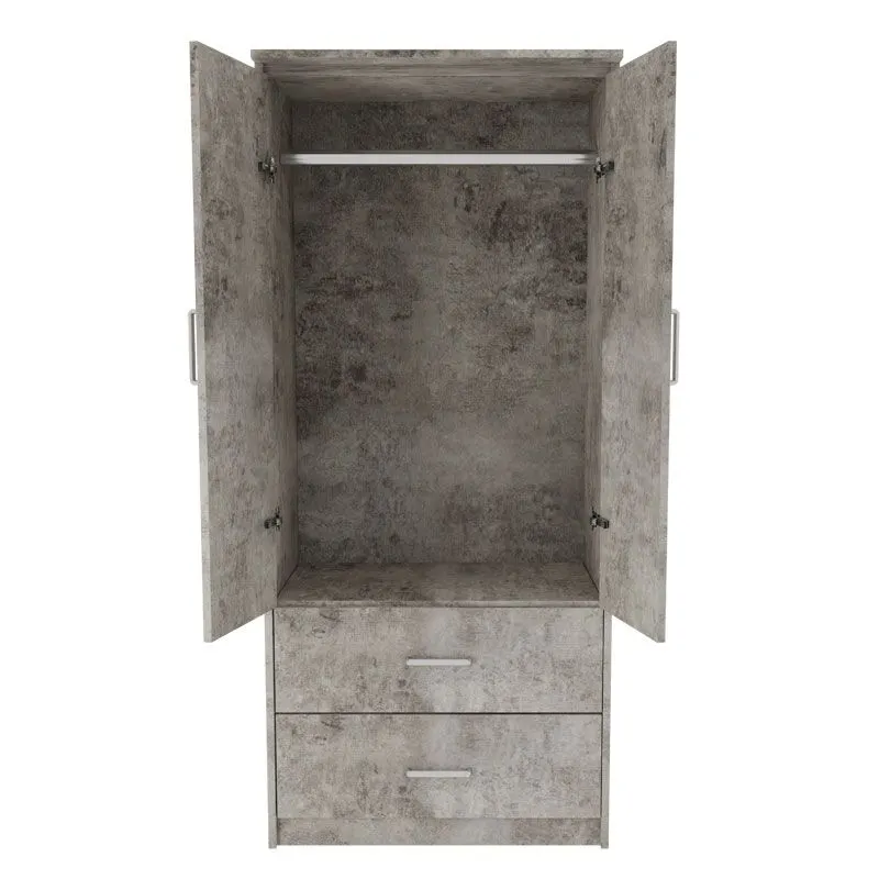 • Διαμόρφωση: Διαθέτει δύο μεγάλες πόρτες, εσωτερική ράγα για κρεμάστρες και δύο μεγάλα συρτάρια στη βάση για πρακτική αποθήκευση ρούχων και αξεσουάρ.