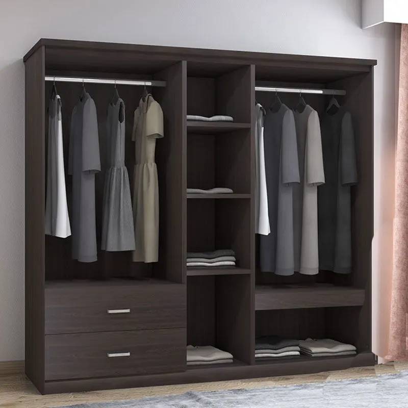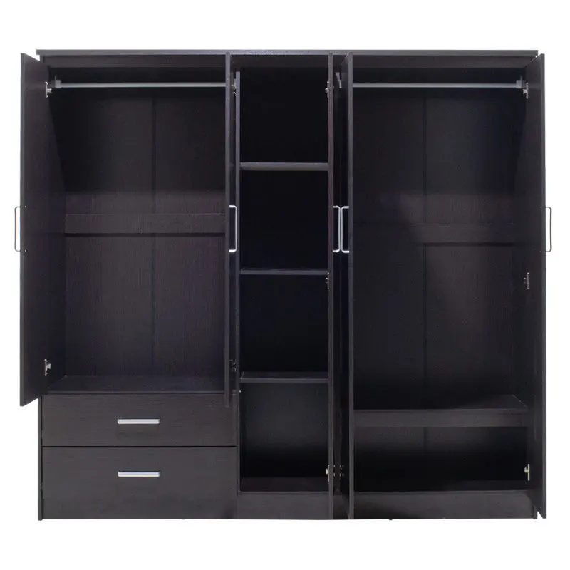 • Διαμόρφωση: Διαθέτει δεξιά και αριστερά δύο διπλά φύλλα με εσωτερική ράγα για κρεμάστρες. Το ένα ντουλάπι περιλαμβάνει δύο μεγάλα συρτάρια στη βάση, ενώ το άλλο φέρει εσωτερικό ράφι. Στο κέντρο της σύνθεσης υπάρχει στενή μονή ντουλάπα με εξωτερικό καθρέφτη και εσωτερικά ράφια, παρέχοντας οργανωμένους χώρους για κάθε αντικείμενο.