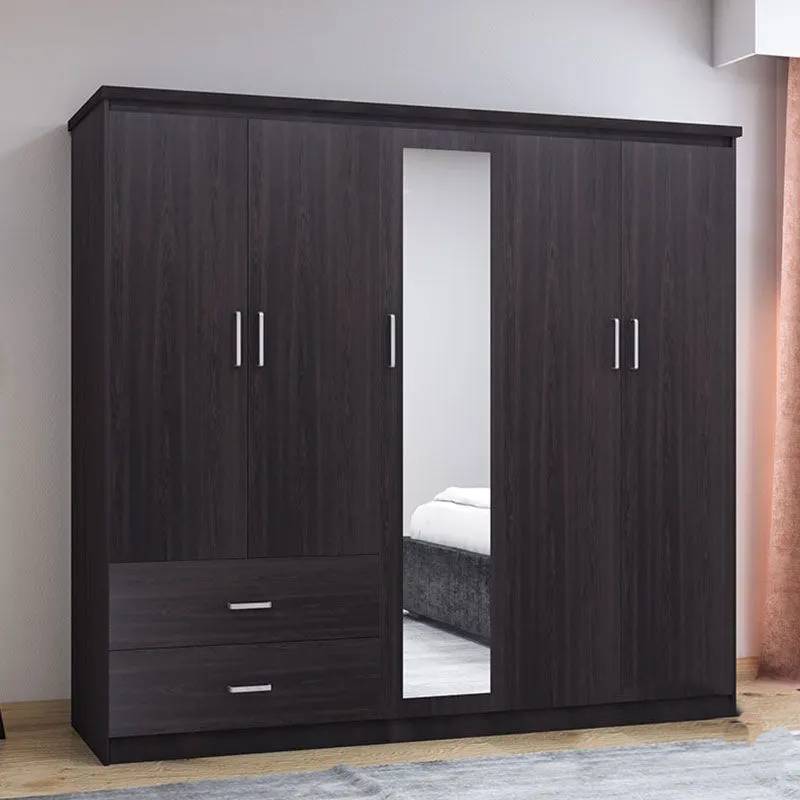Η πεντάφυλλη ντουλάπα Olympus σε χρώμα wenge προσφέρει μεγάλο αποθηκευτικό χώρο, δύο συρτάρια, ράγες για κρεμάστρες και κεντρική μονή ντουλάπα με καθρέφτη. Ιδανική για τάξη, οργάνωση και κομψή διακόσμηση σε κάθε χώρο.