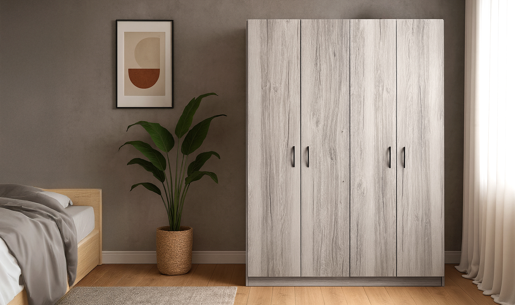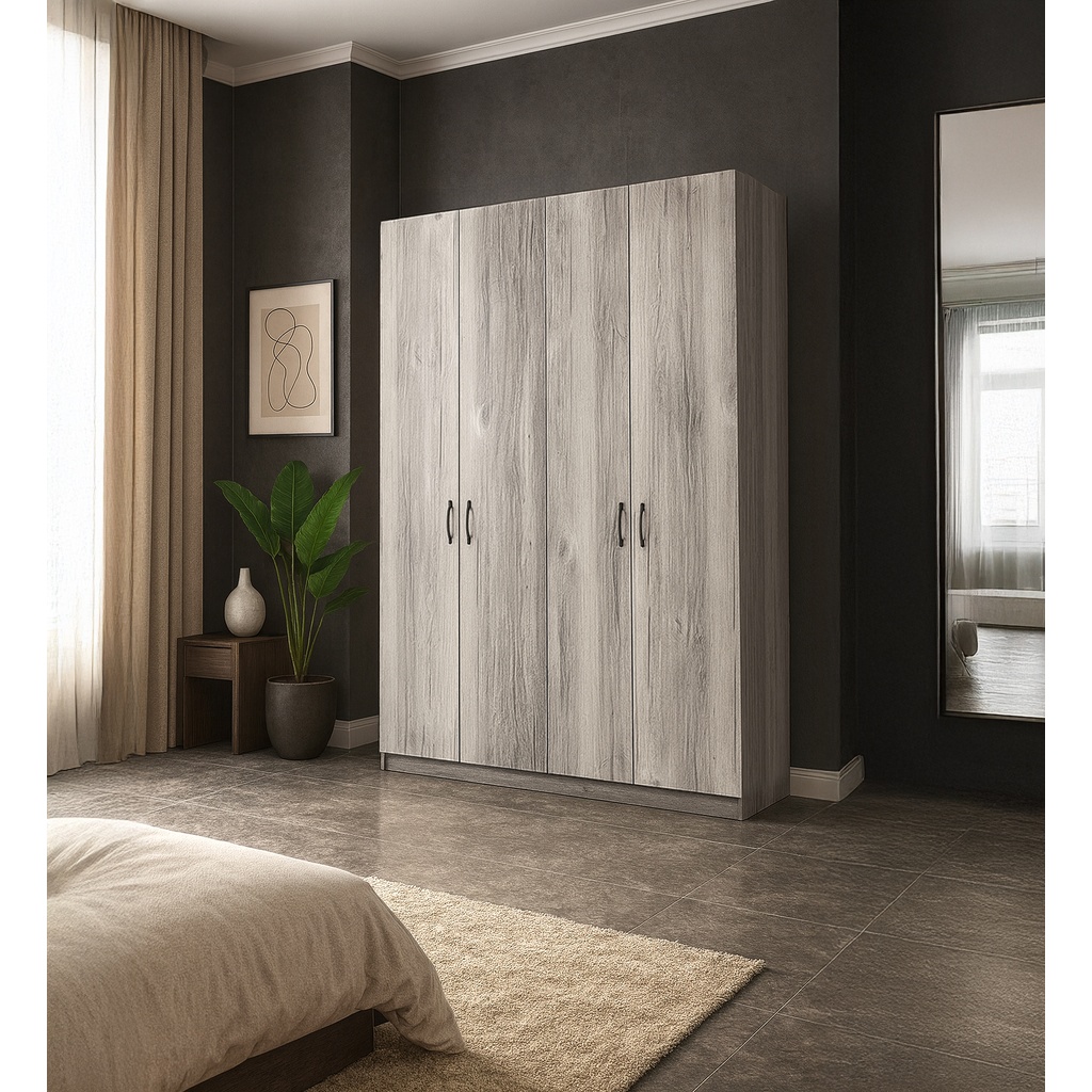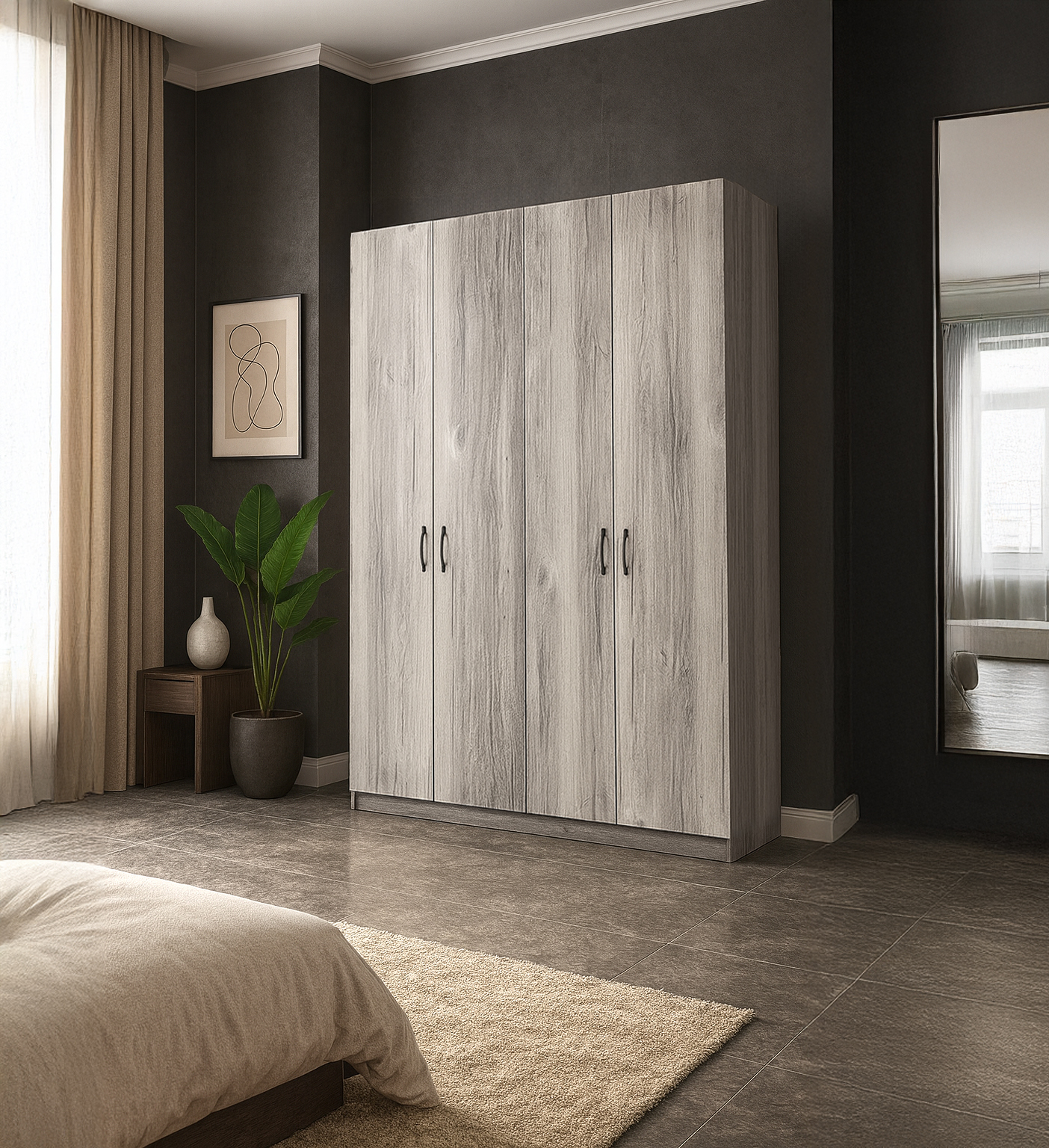 Η τετράφυλλη ντουλάπα σε απόχρωση σταχτί συνδυάζει κομψότητα και πρακτικότητα, προσφέροντας άφθονο αποθηκευτικό χώρο για ρούχα και αξεσουάρ. Ο λιτός σχεδιασμός της με φυσική υφή ξύλου ταιριάζει ιδανικά σε κάθε υπνοδωμάτιο, προσθέτοντας διακριτική αισθητική και μοντέρνο χαρακτήρα.