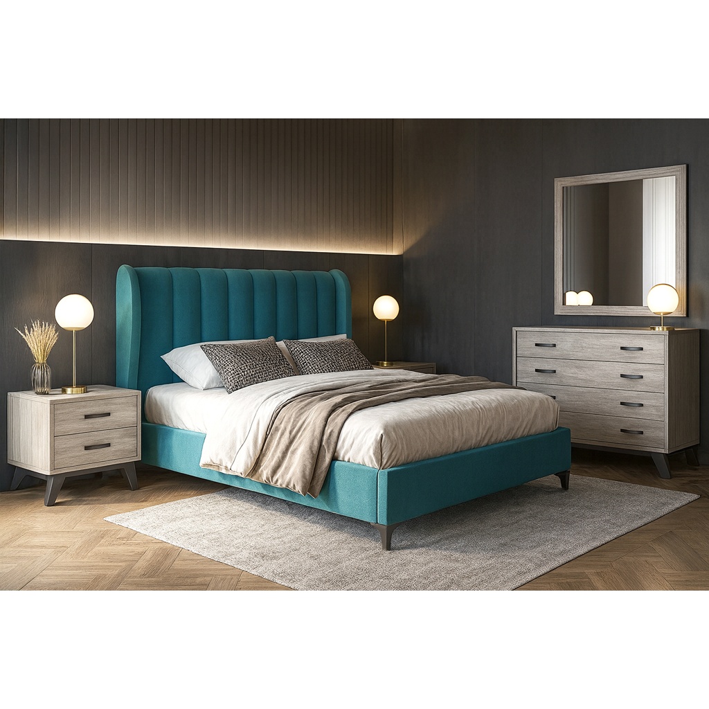 Σετ κρεβατοκάμαρας με ύφασμα και μοντέρνο σχεδιασμό που προσφέρει αρμονία και άνεση στον χώρο. Περιλαμβάνει κρεβάτι με κομψό κεφαλάρι, δύο πρακτικά κομοδίνα, λειτουργική τουαλέτα και καθρέφτη. Ιδανική επιλογή για ένα ολοκληρωμένο και καλαίσθητο υπνοδωμάτιο.